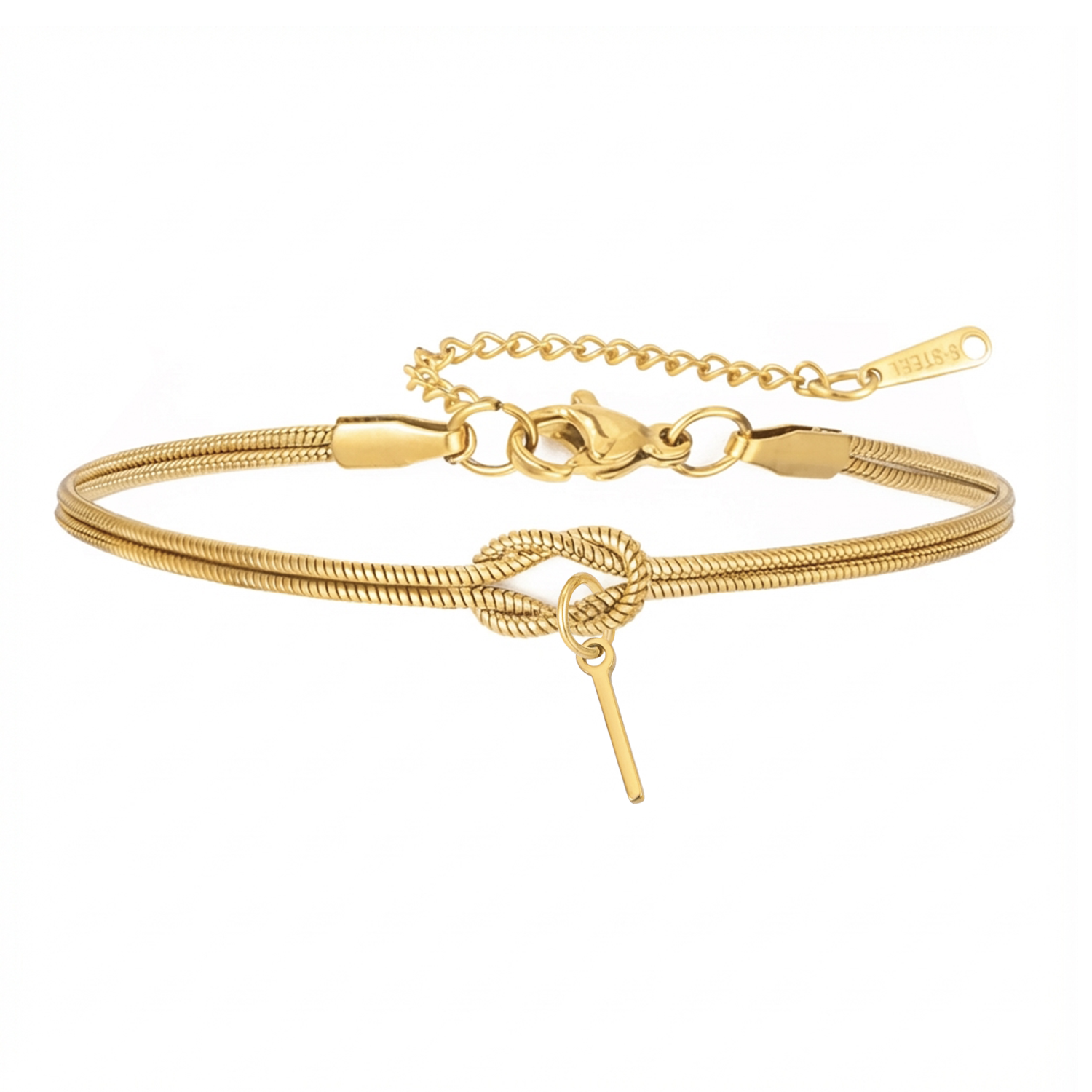 To initialer, du vælger at bære hver dag. Dette slanke, moderne armbånd kombinerer en elegant slangeskæde med en symbolsk knude, hvorfra to personlige initialer hænger, et symbol på et stærkt bånd. En subtil detalje, der siger meget: uanset om det er din egen initial eller en elskets, forbliver den værdifuld og altid tæt på.