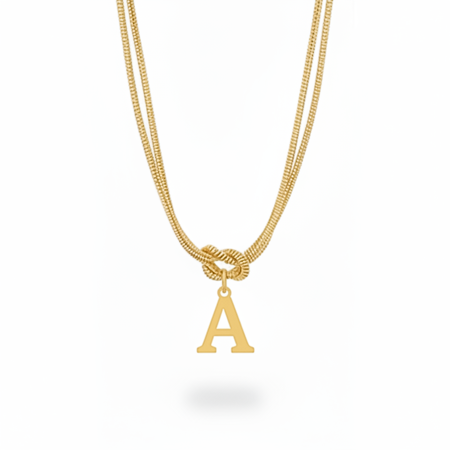 En raffineret dobbeltkæde med en elegant initialvedhæng, der hænger fra en sofistikeret knude-detalje. Den polerede bogstavscharme tilføjer et personligt præg til ethvert look.