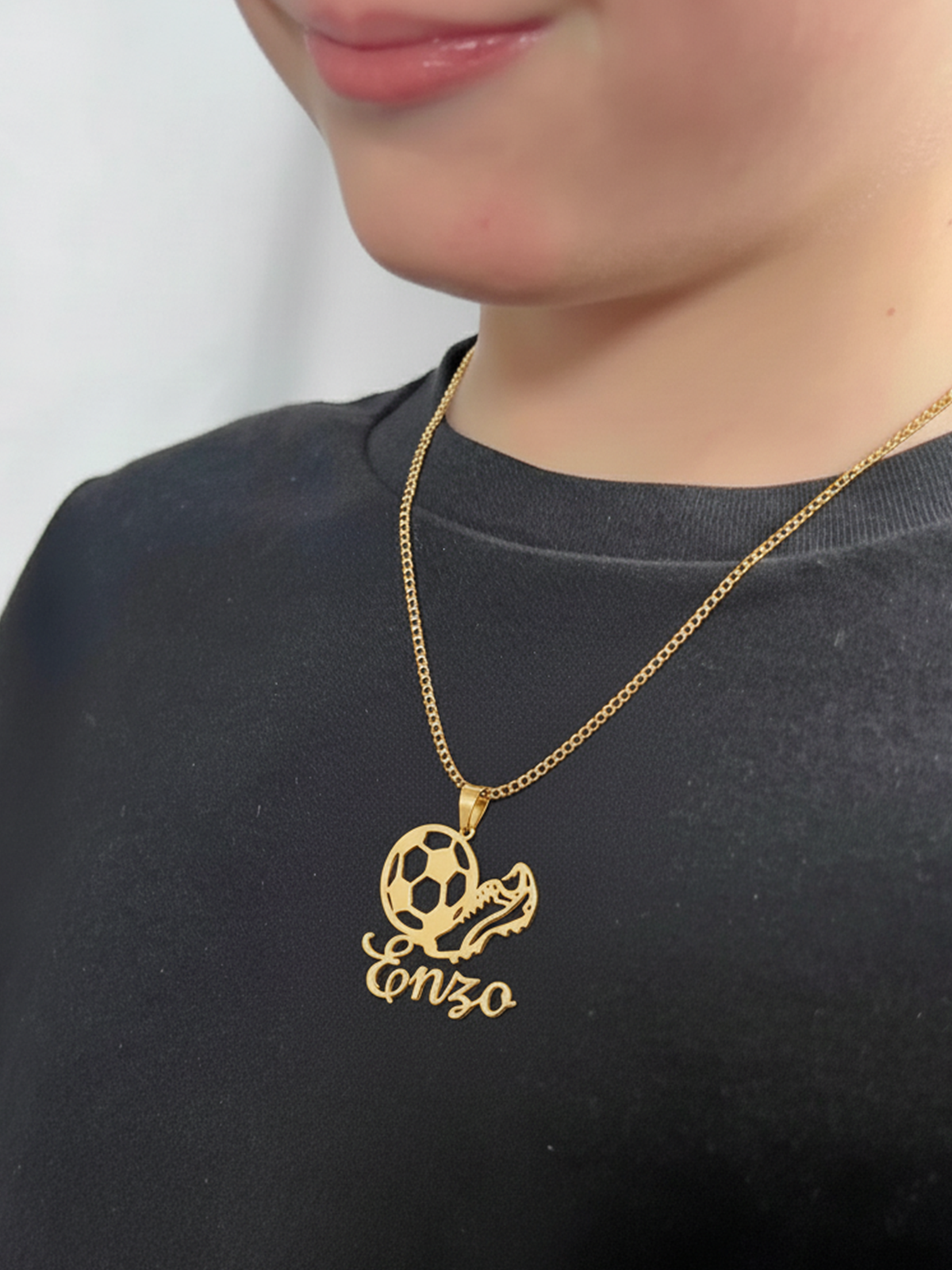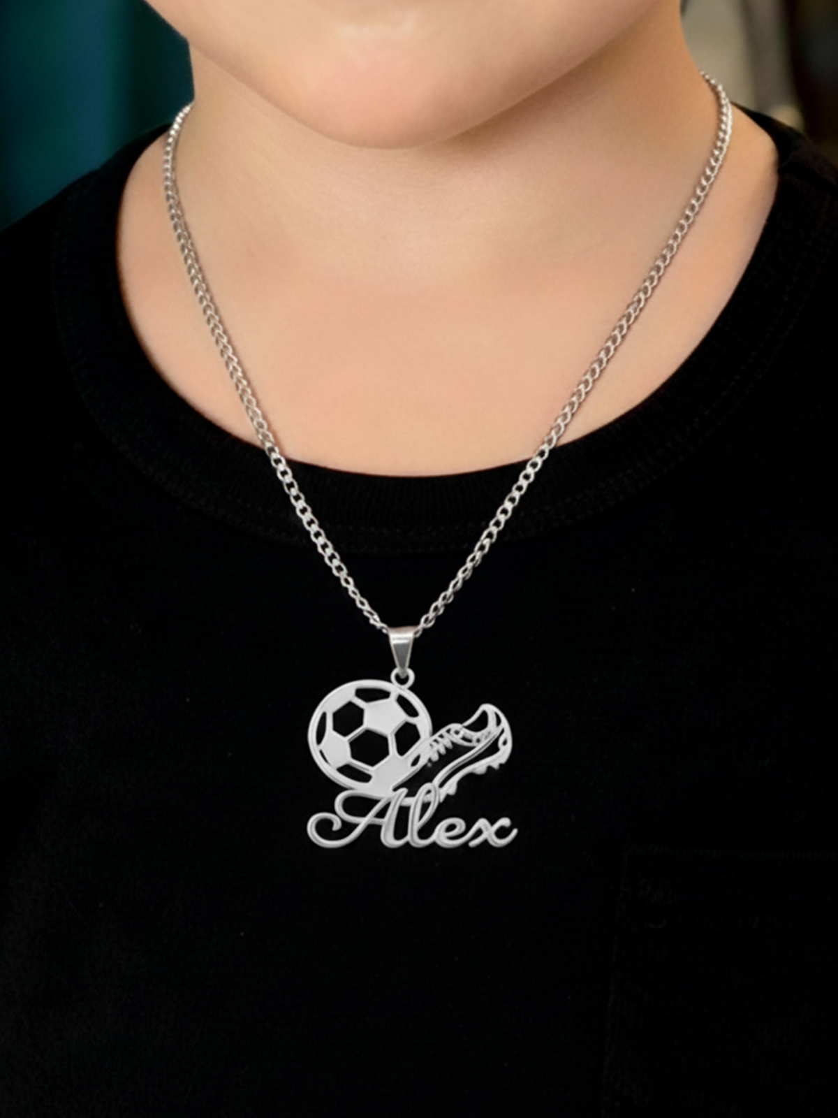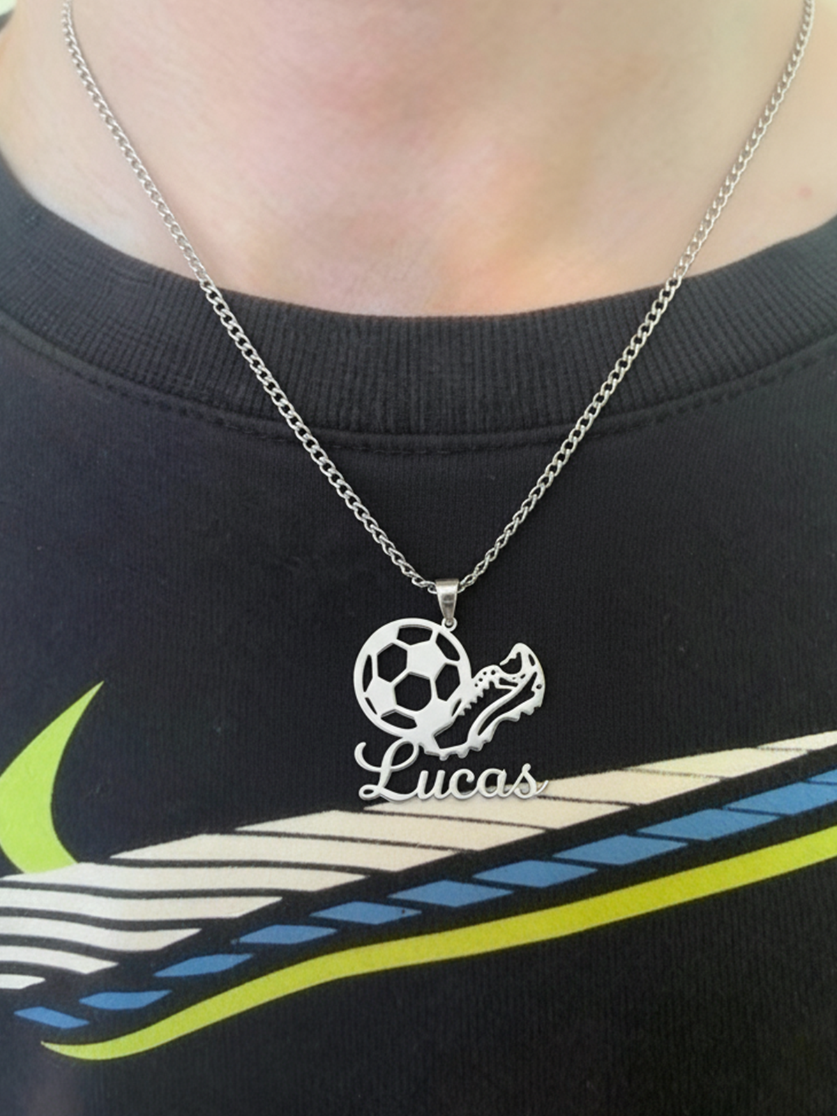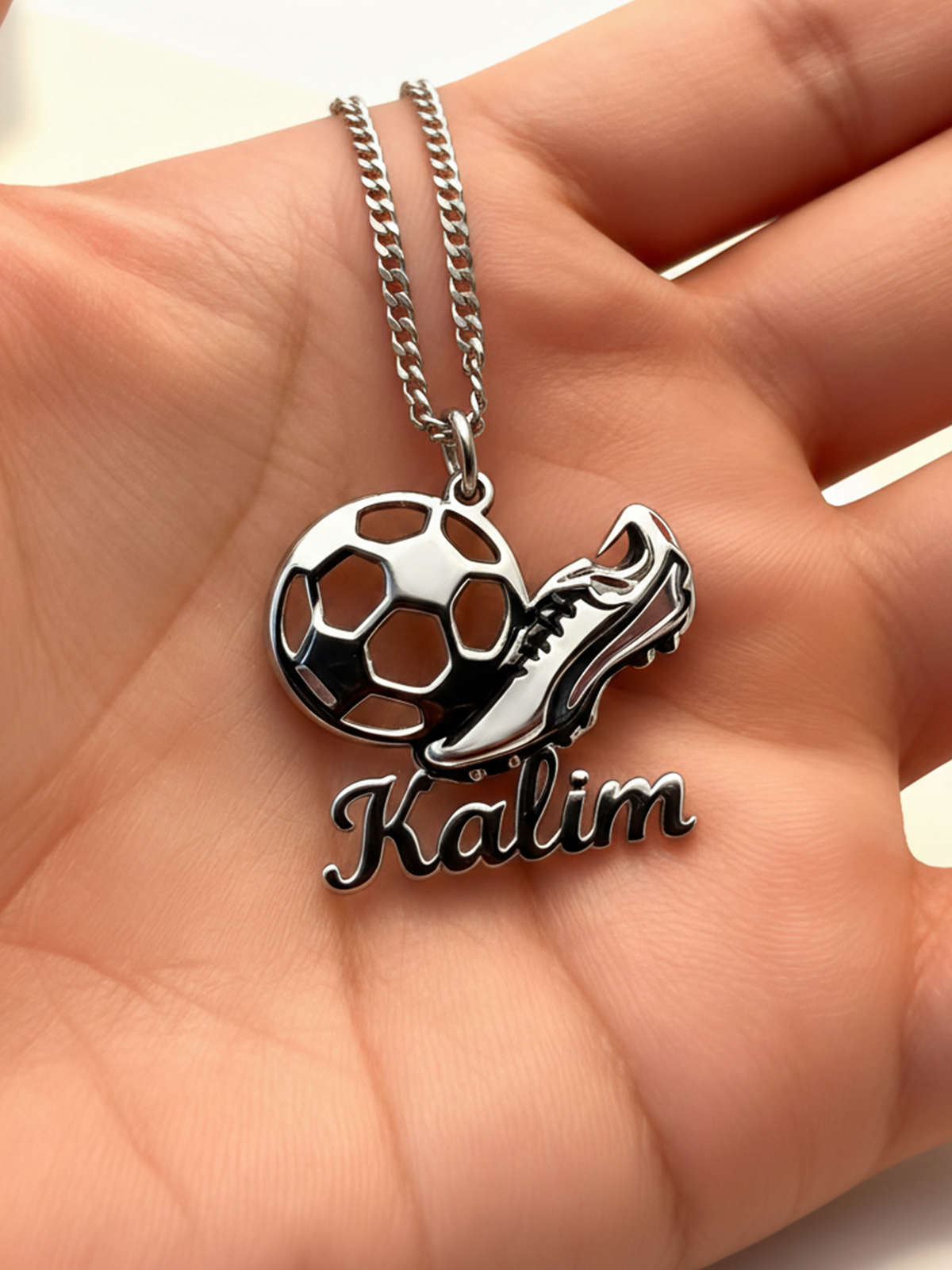 For fodboldelskere i alle aldre. Vores Personalized Football Name Necklace har et detaljeret design med en fodbold og fodboldstøvle samt indgravering af et tilpasset navn.