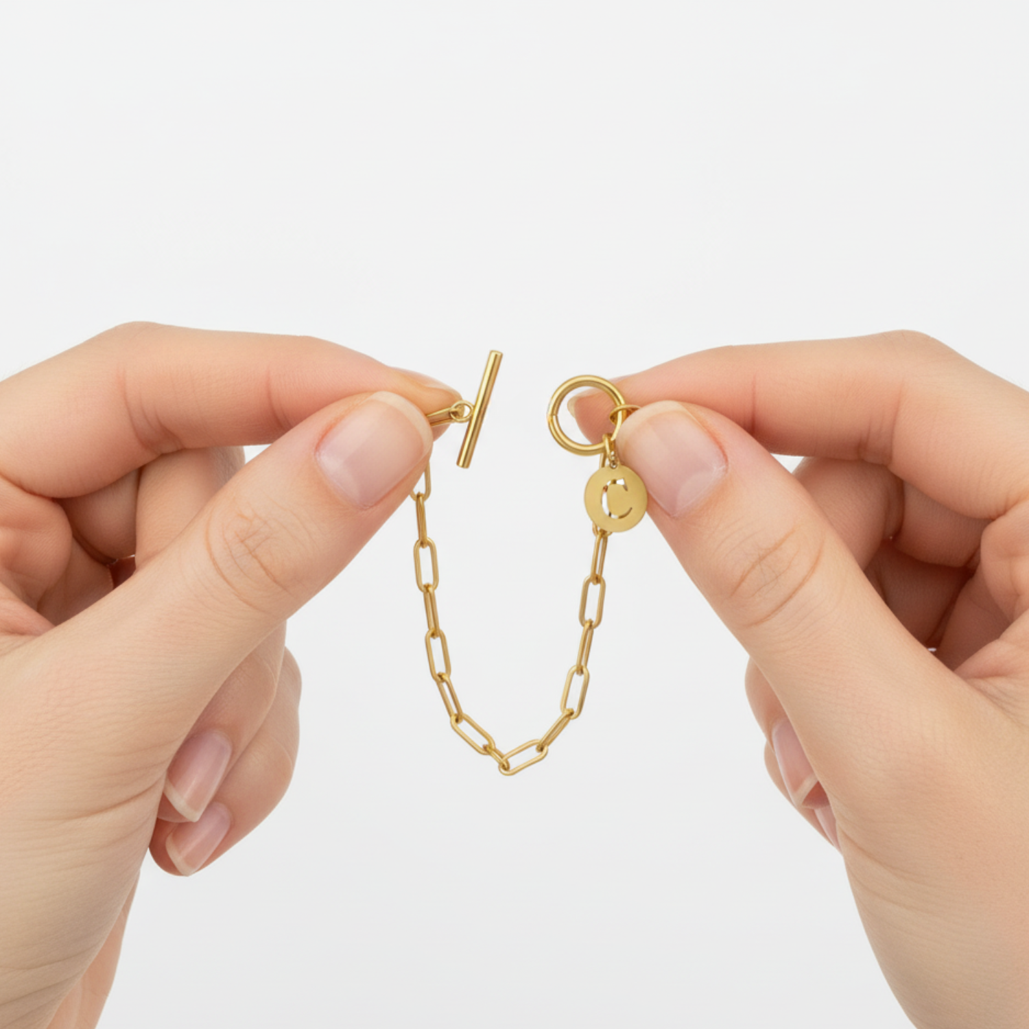 Vis stolt dit initial (eller en elsket persons) med dette curb-kæde armbånd, forbedret med en graveret medaljon. Dets raffinerede toggle-lukning giver det et trendy og elegant præg, perfekt til enhver lejlighed.
