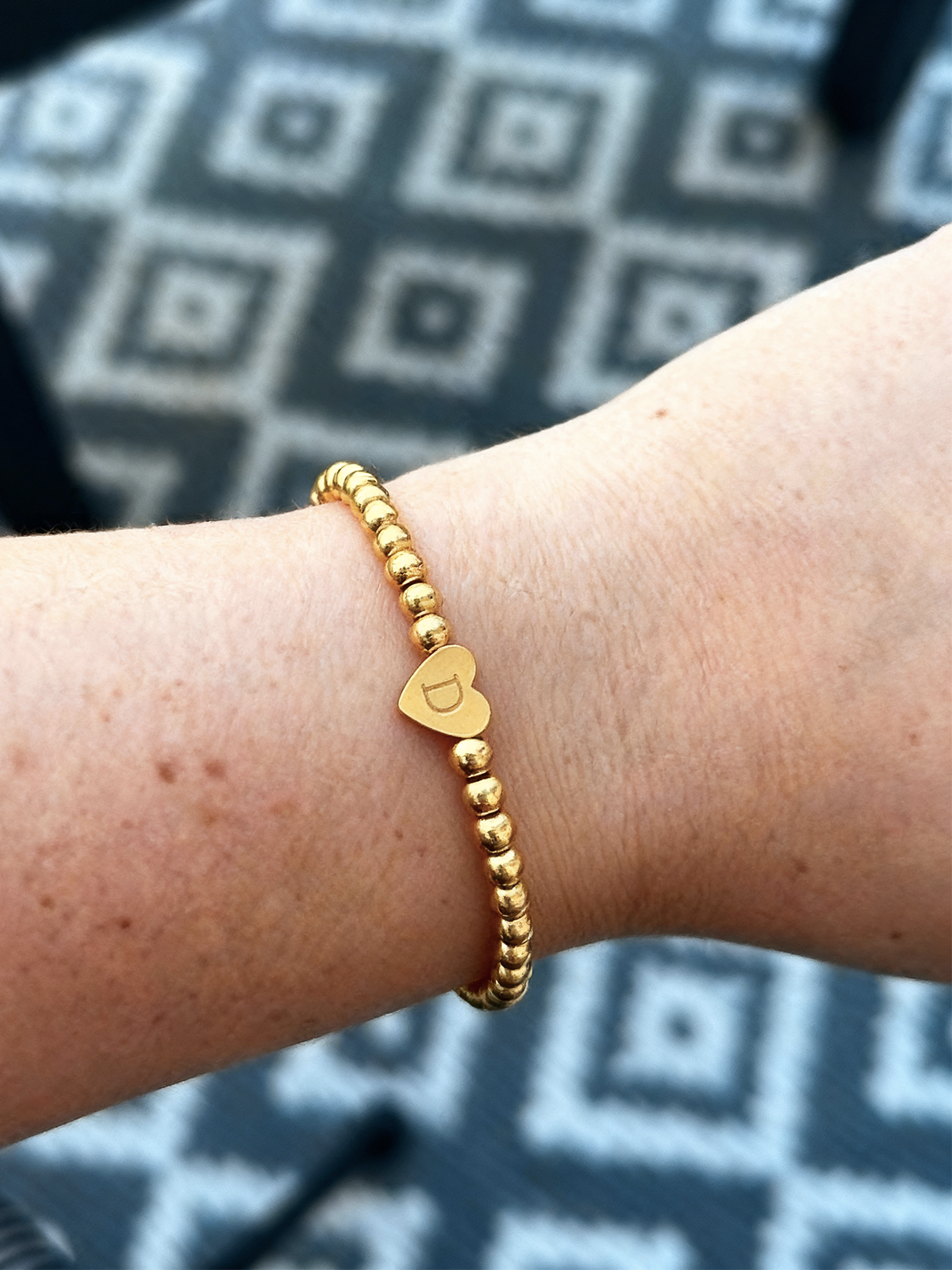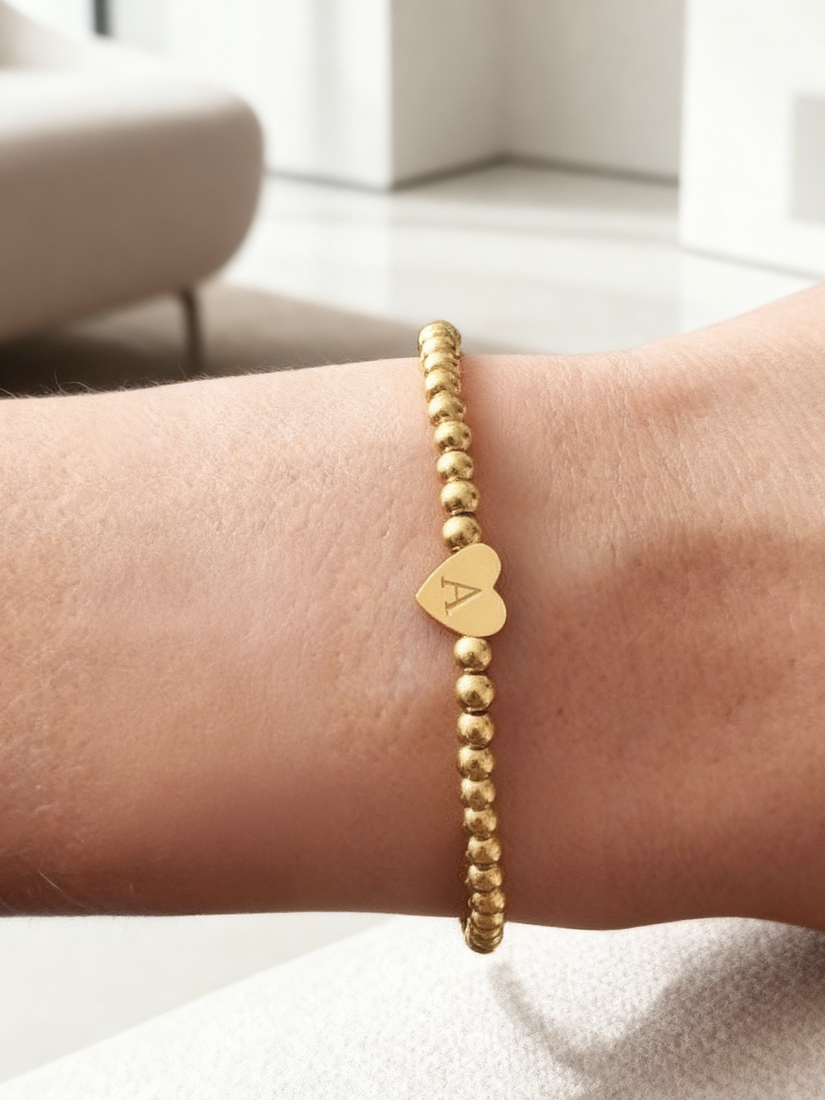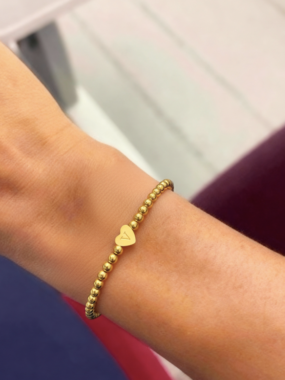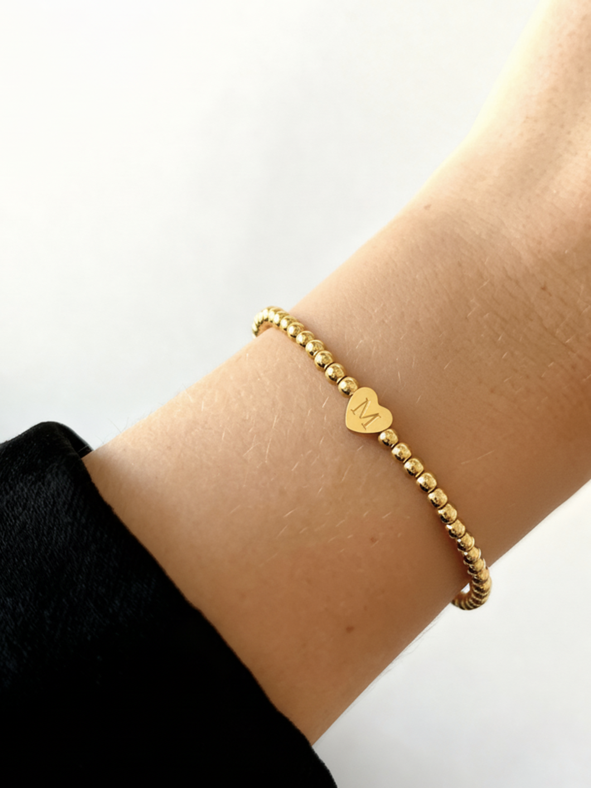 Dette raffinerede armbånd, lavet af guldfarvede eller sølvfarvede perler, er fremhævet af et lille centralt hjerte graveret med det initial, du vælger. Det symboliserer kærlighed, familie eller venskab og passer til alle håndled takket være dets behagelige stretch-design. Uanset om det er som gave eller forkælelse til dig selv, indkapsler dette minimalistiske og elegante smykke en unik forbindelse.