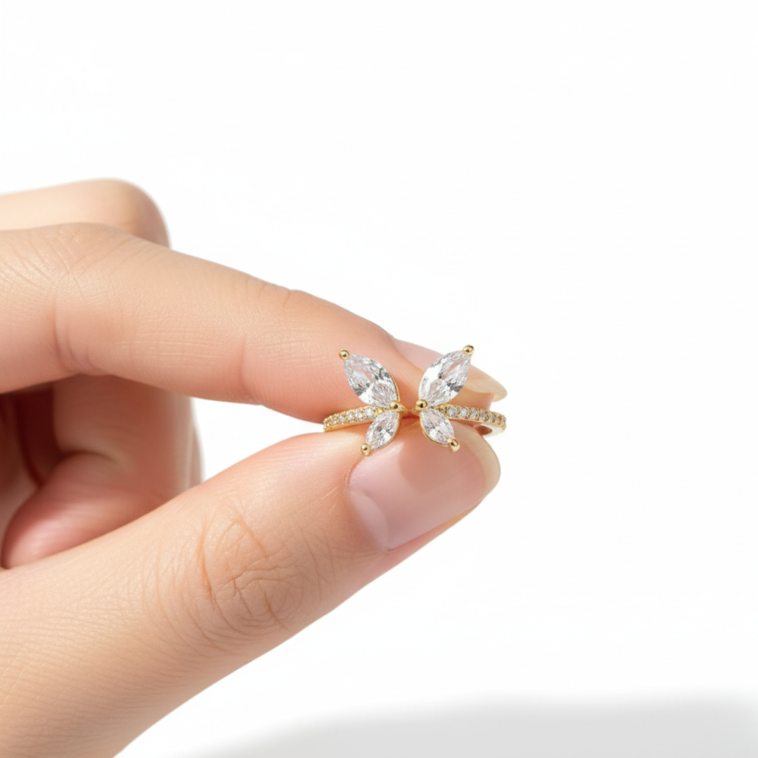 Elegance i flugt. Denne sommerfuglering fanger øjeblikkets skrøbelighed, hvor skønhed og frihed mødes. Dens funklende vinger, prydet med fantastiske marquise-slebne krystaller, synes klar til at vågne til live ved den mindste brise.