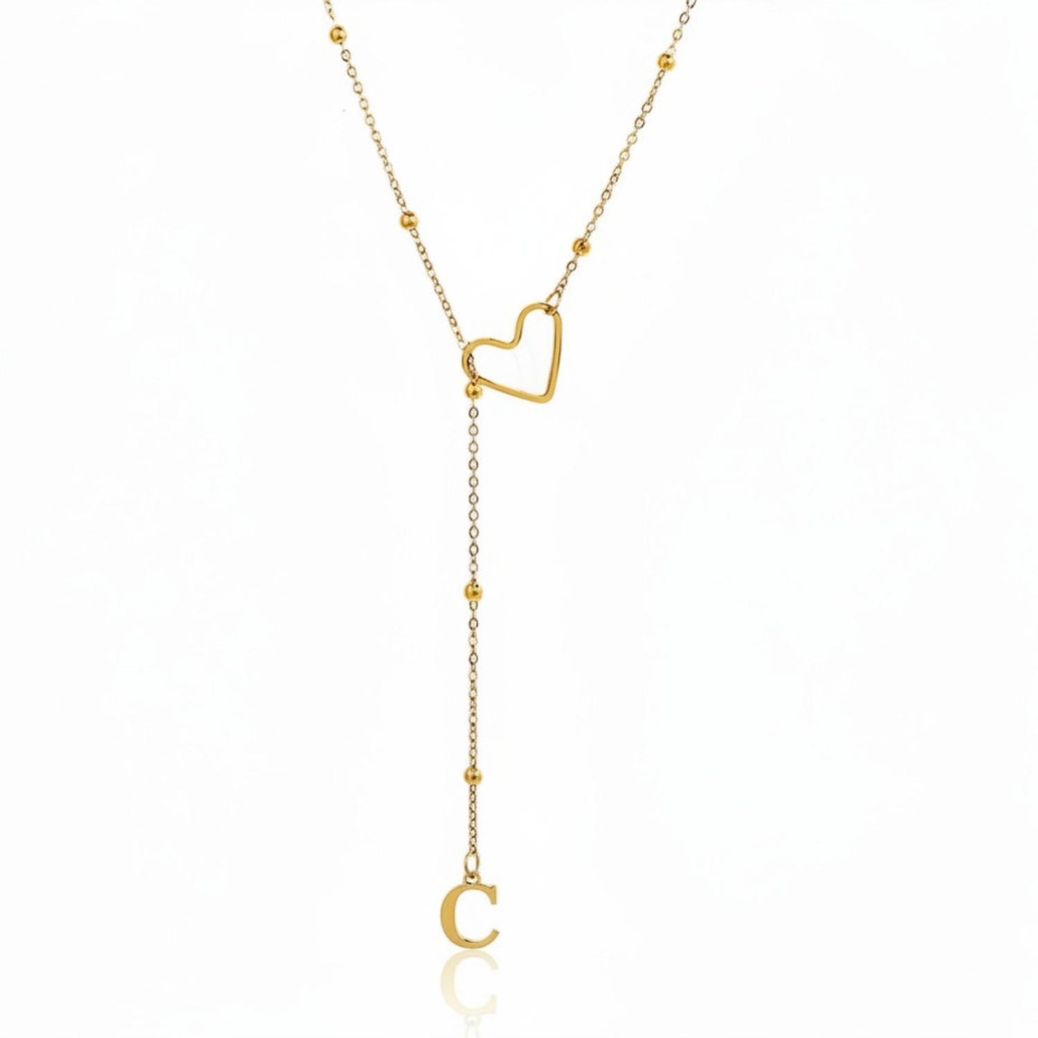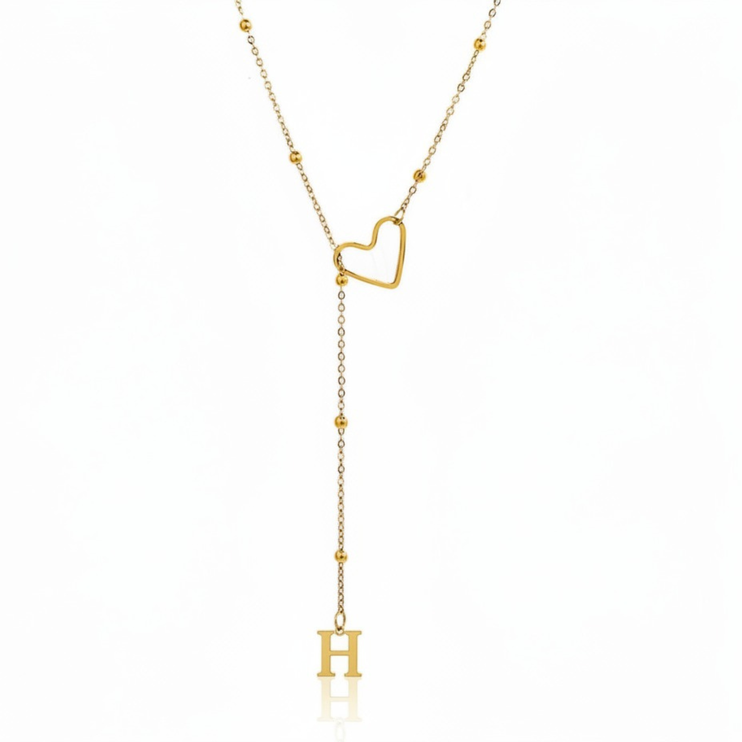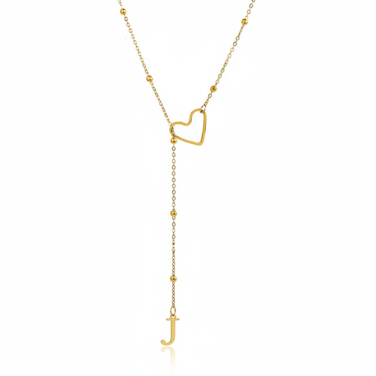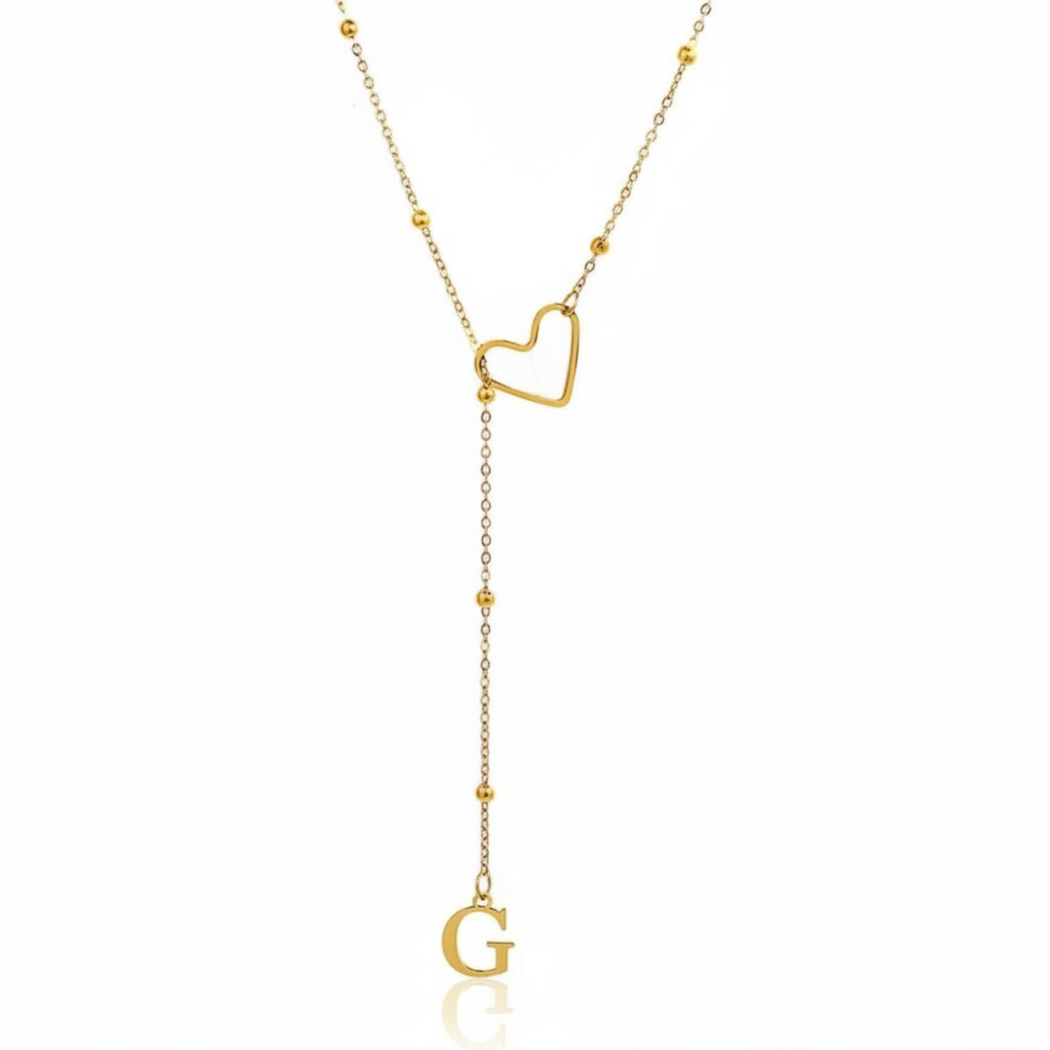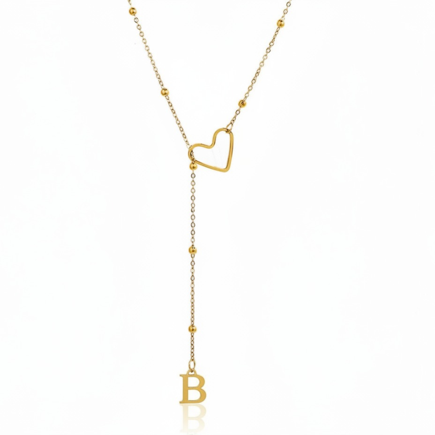 Denne raffinerede halskæde indfanger selve essensen af personlig forbindelse: et delikat ophængt bogstav, der blidt passerer gennem et gyldent hjerte, som symboliserer dyb og intim tilknytning.