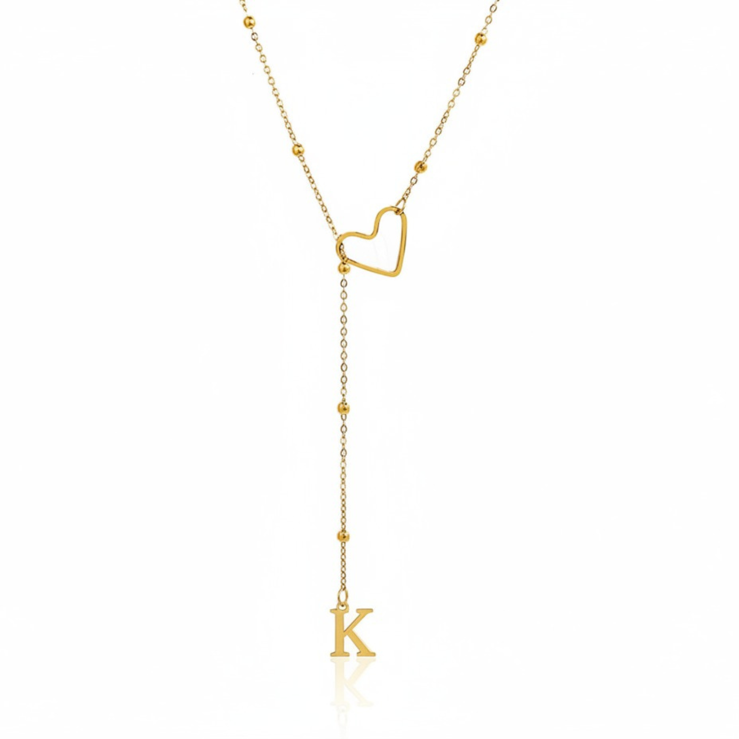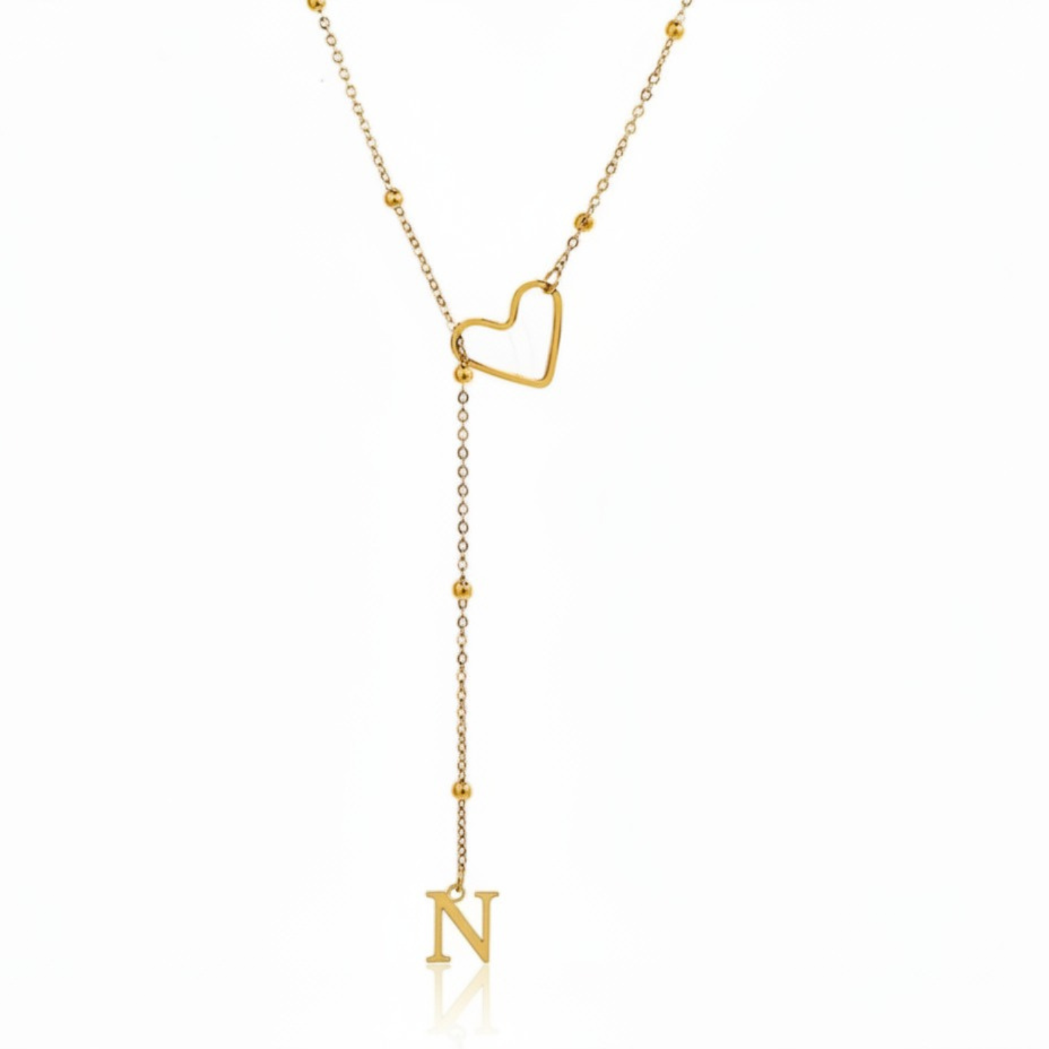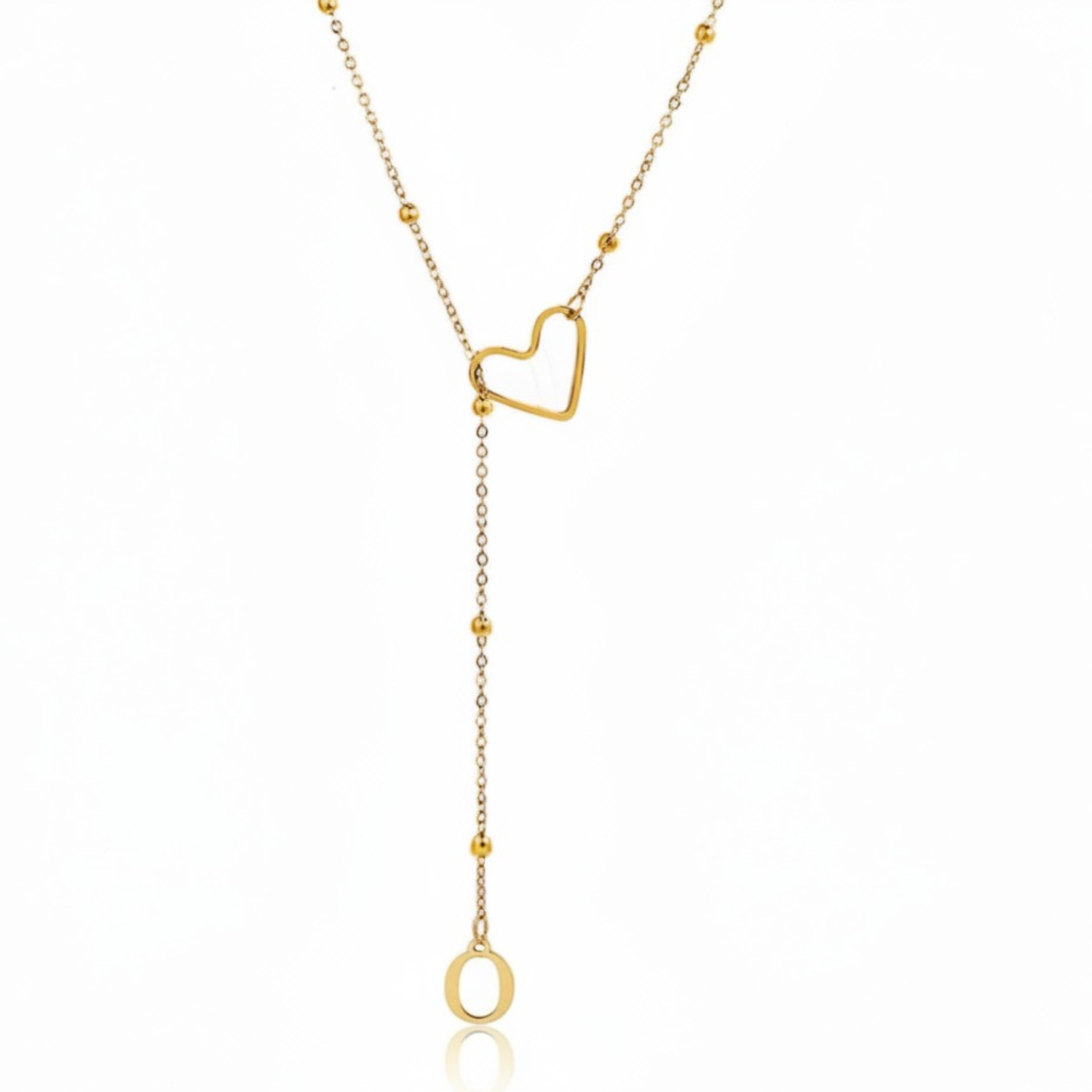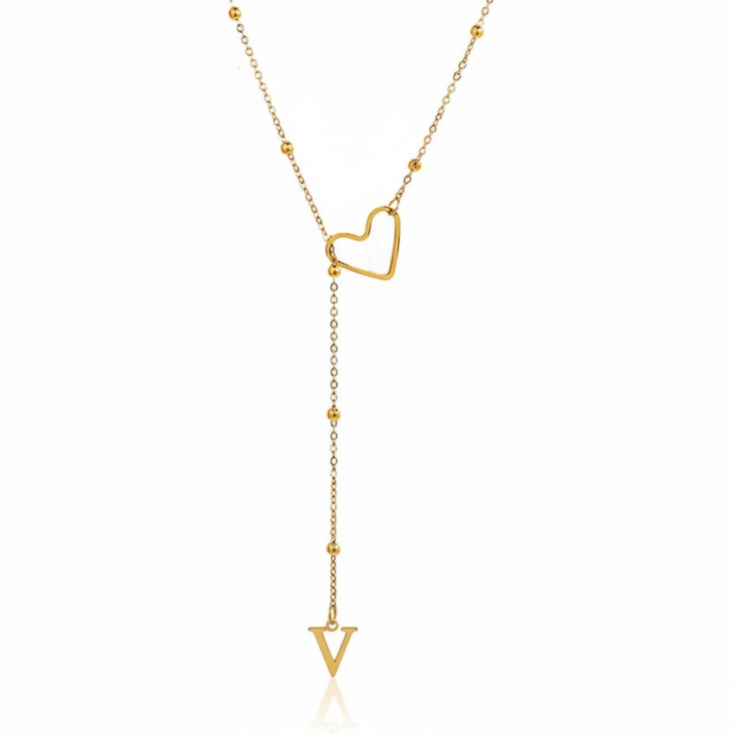 Denne raffinerede halskæde indfanger selve essensen af personlig forbindelse: et delikat ophængt bogstav, der blidt passerer gennem et gyldent hjerte, som symboliserer dyb og intim tilknytning.