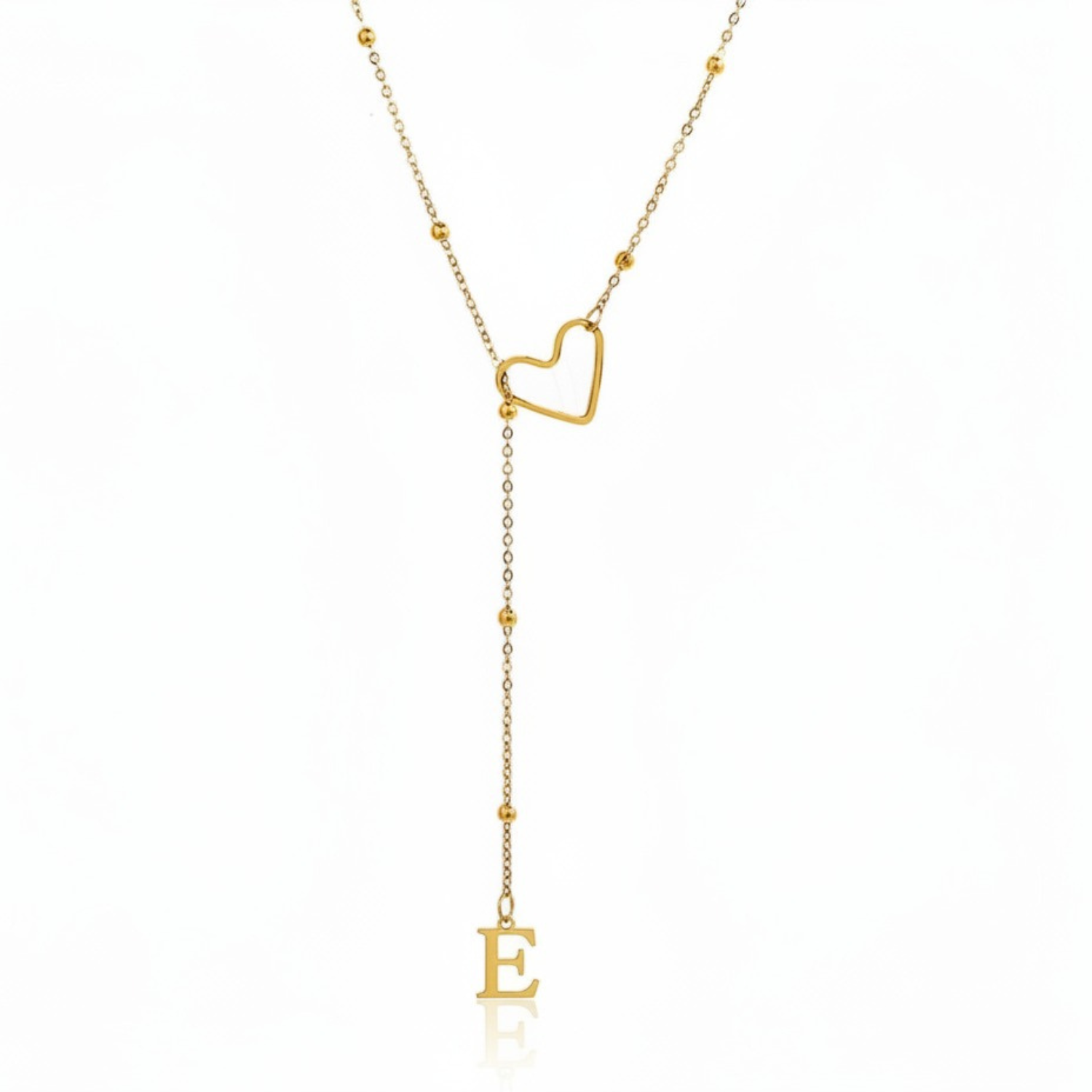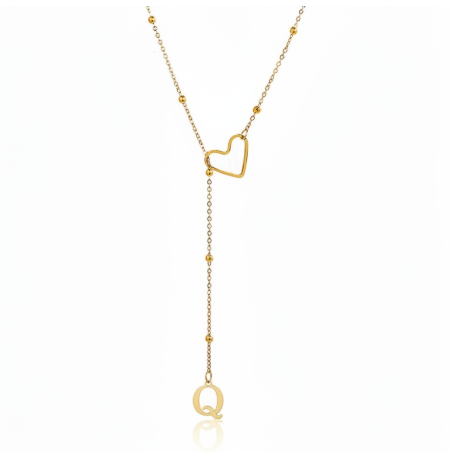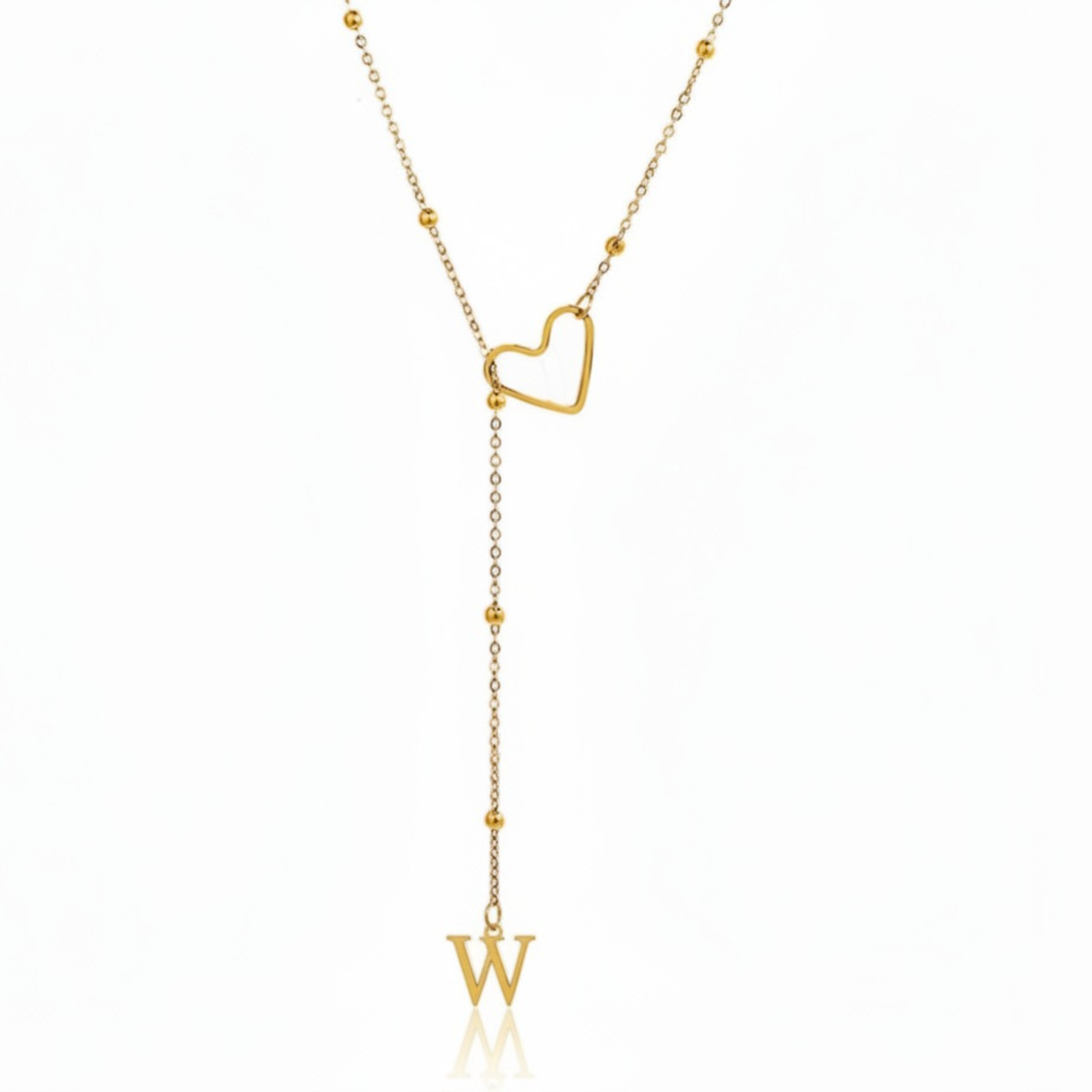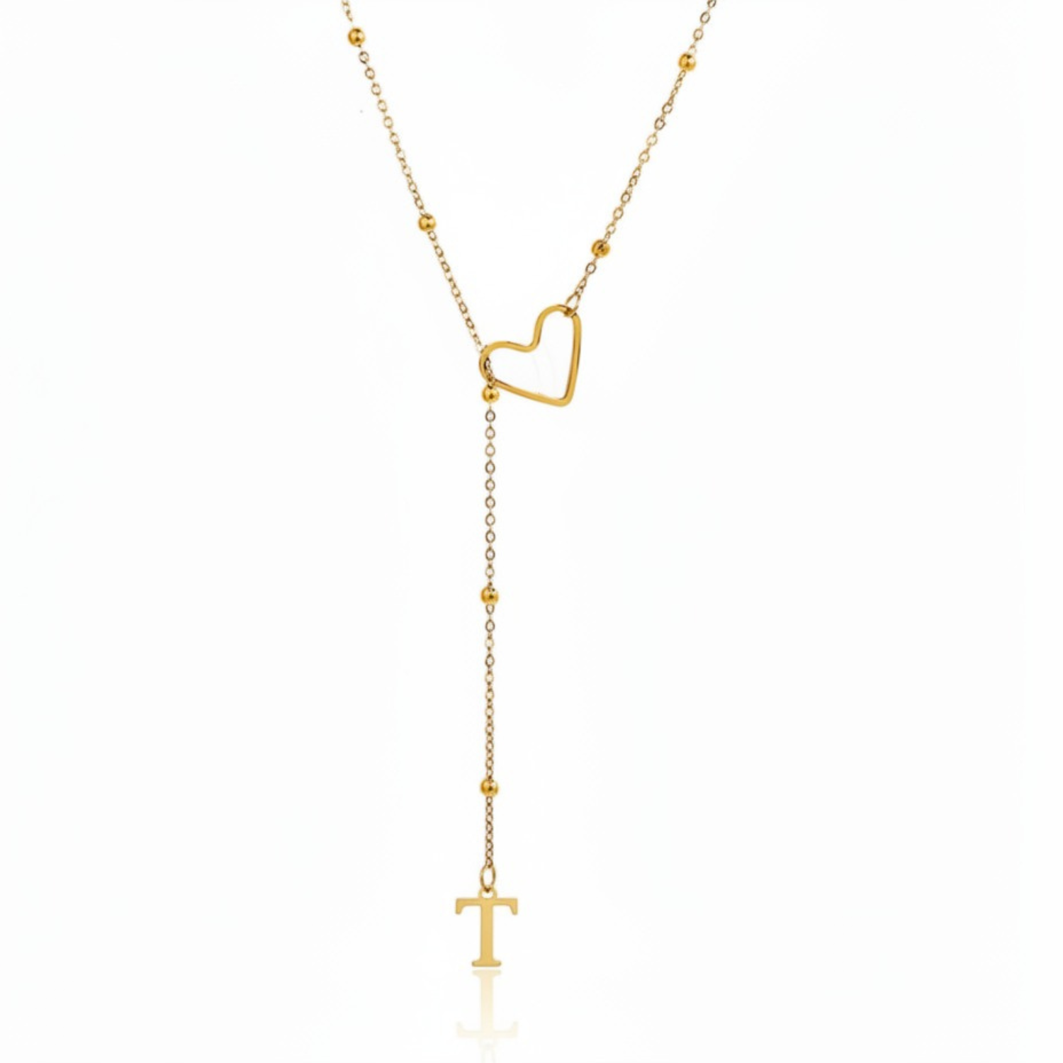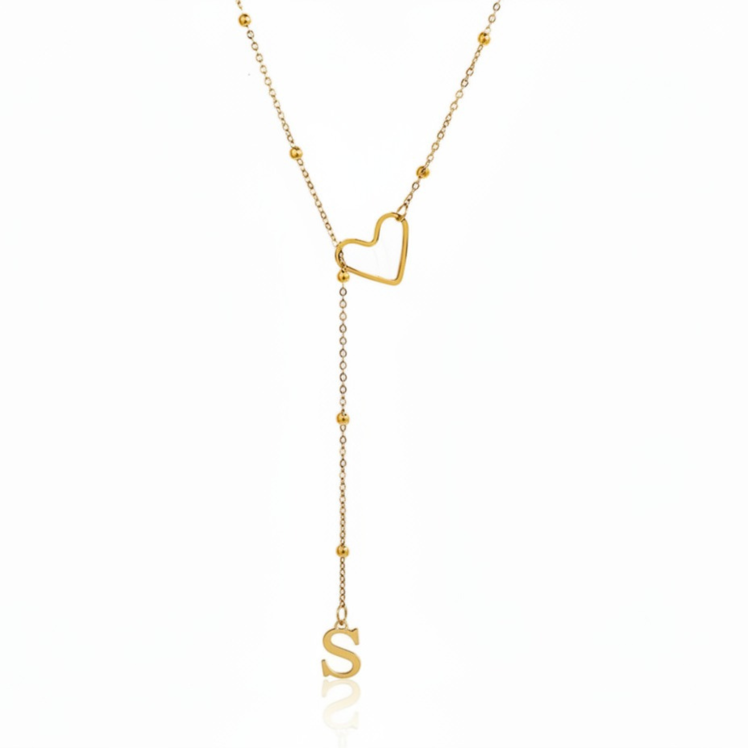 Denne raffinerede halskæde indfanger selve essensen af personlig forbindelse: et delikat ophængt bogstav, der blidt passerer gennem et gyldent hjerte, som symboliserer dyb og intim tilknytning.