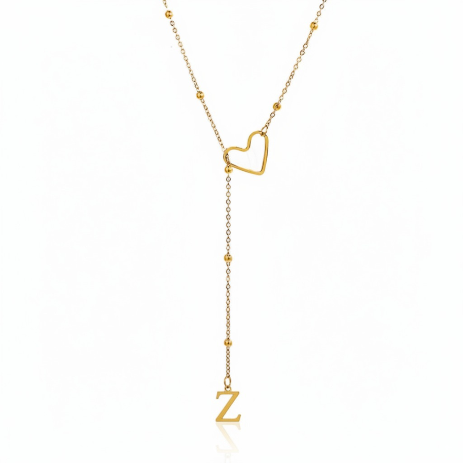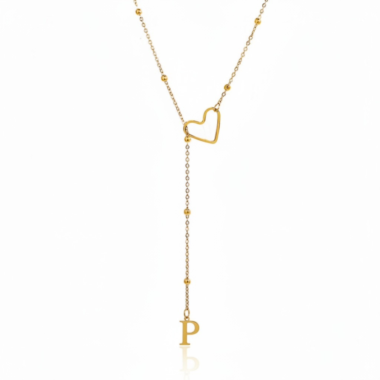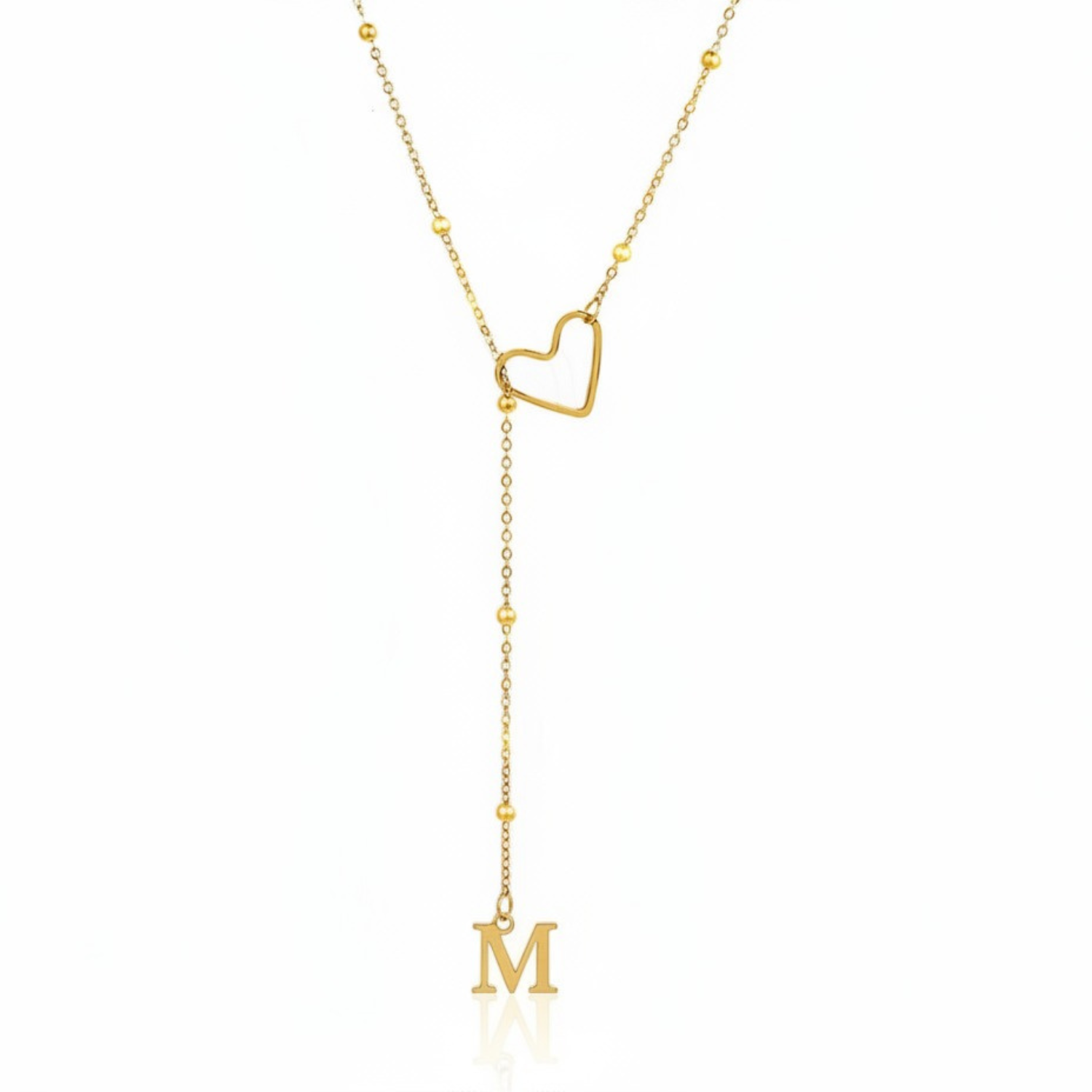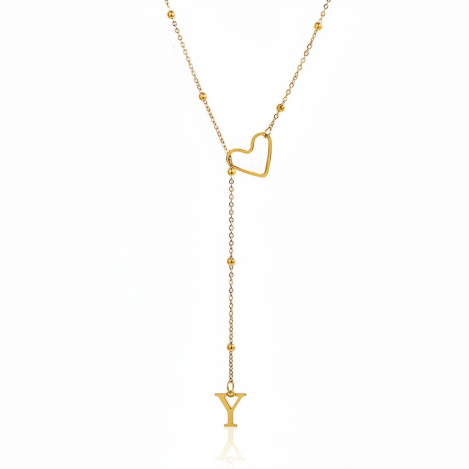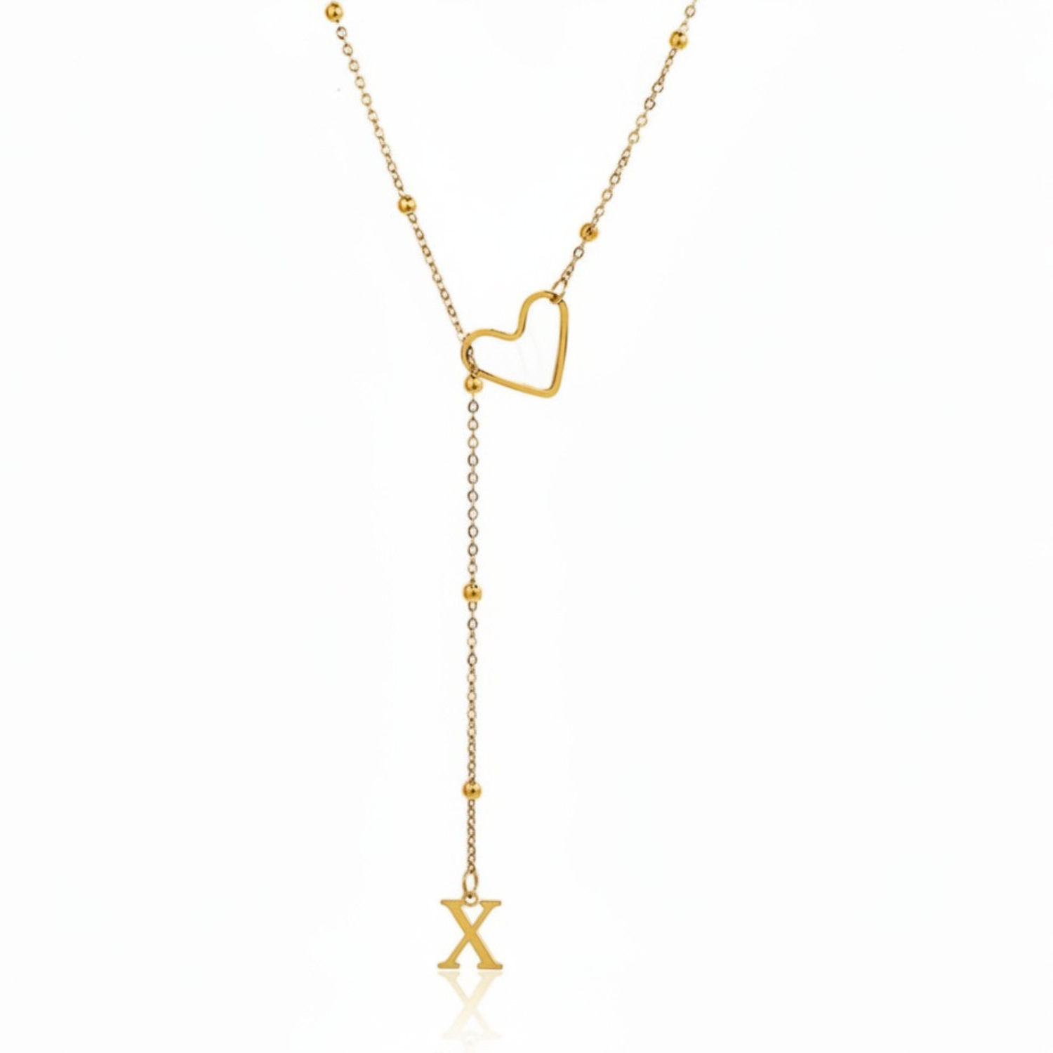 Denne raffinerede halskæde indfanger selve essensen af personlig forbindelse: et delikat ophængt bogstav, der blidt passerer gennem et gyldent hjerte, som symboliserer dyb og intim tilknytning.