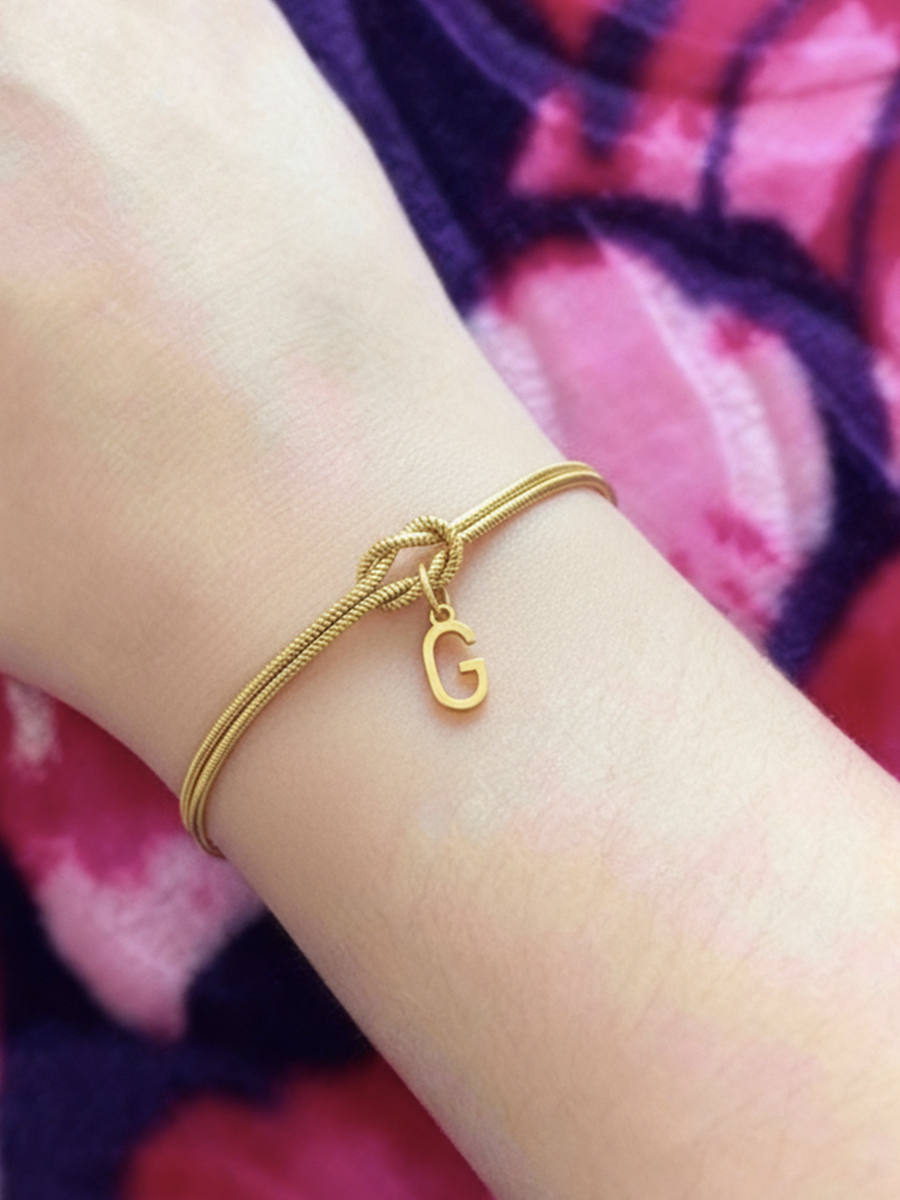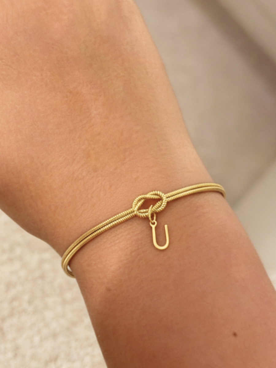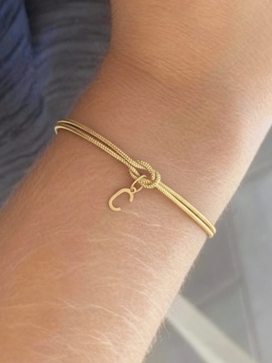 Et led, du vælger at bære hver dag. Dette slanke, moderne armbånd kombinerer en elegant slangekæde med en symbolsk knude, hvor en personlig initial hænger og udtrykker en stærk tilknytning. En subtil detalje, der siger meget: uanset om det er dit eget Letter eller en elskets, forbliver det værdifuldt og tæt på dig.