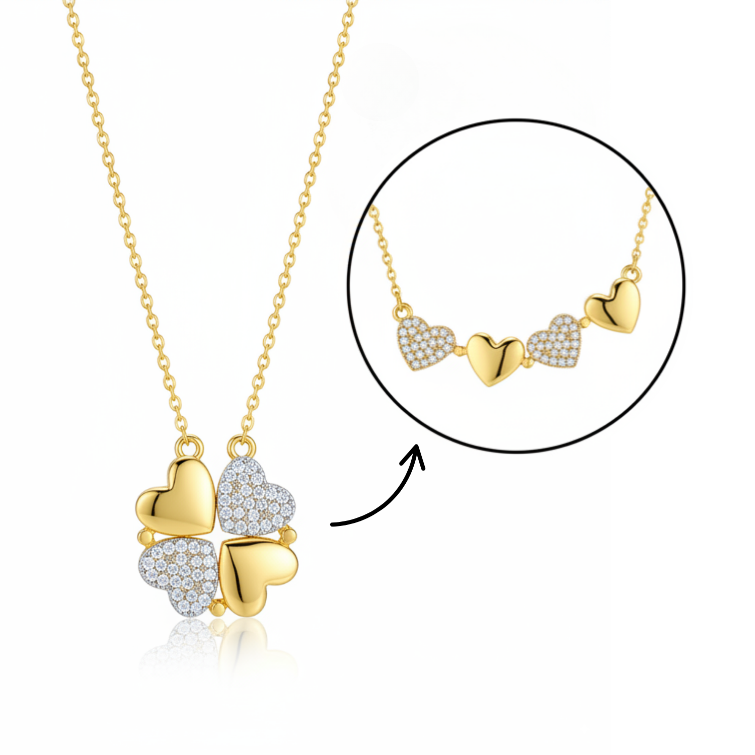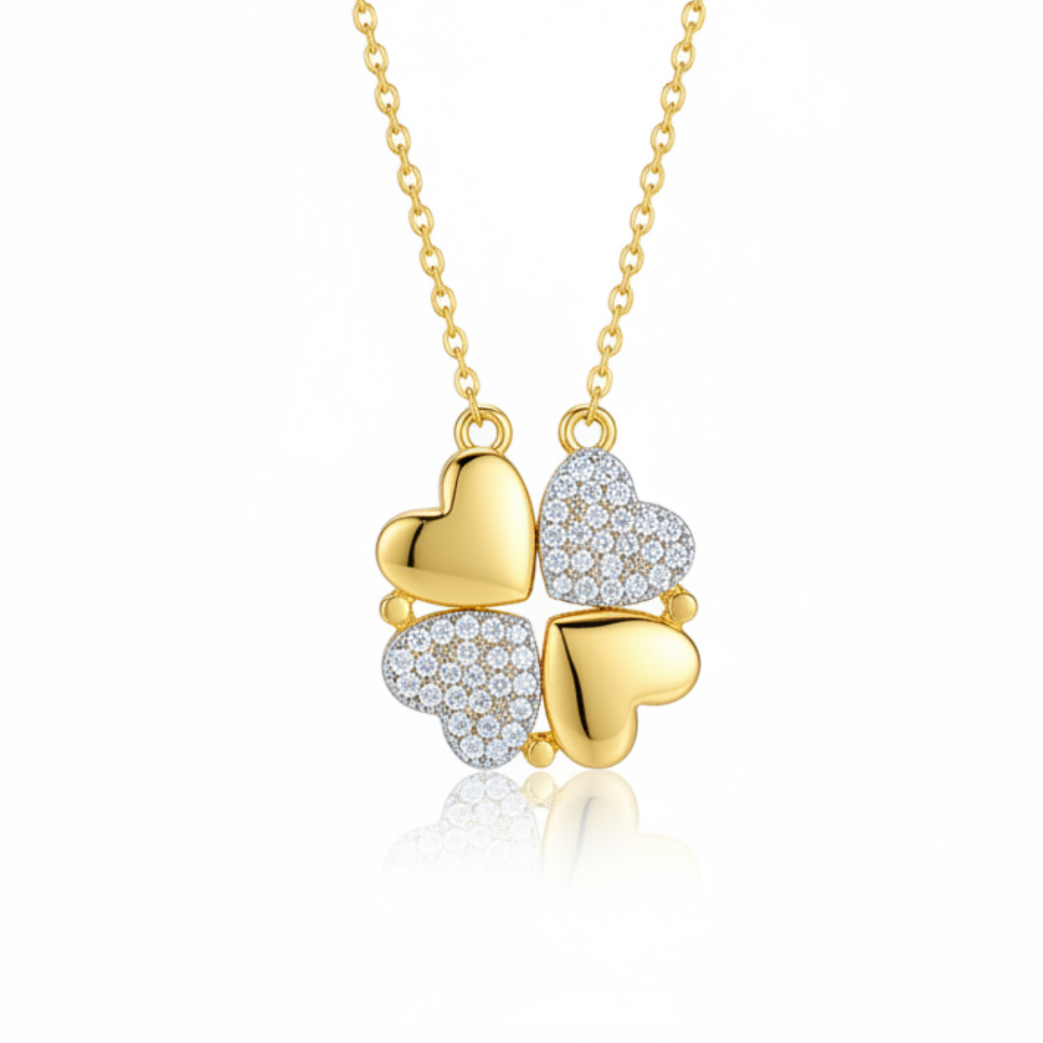 Denne halskæde har fire gyldne hjerter, to glitrende med krystaller, to blødt polerede, der sammen danner en delikat firkløver. Et smart design, der blander romantik og held, skabt til at ledsage sin bærer med ynde og mening.