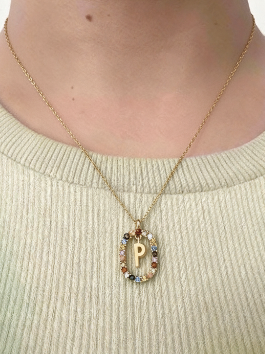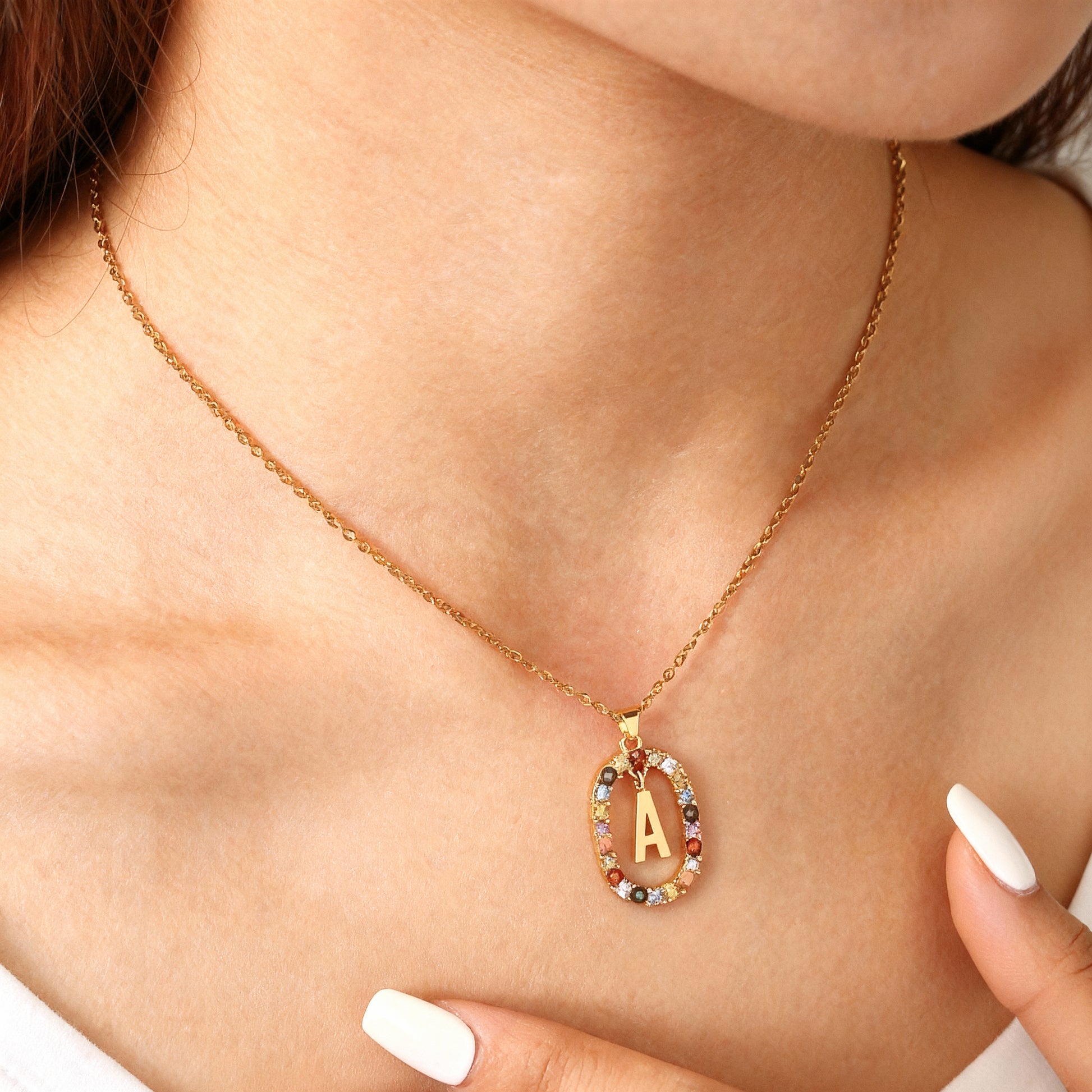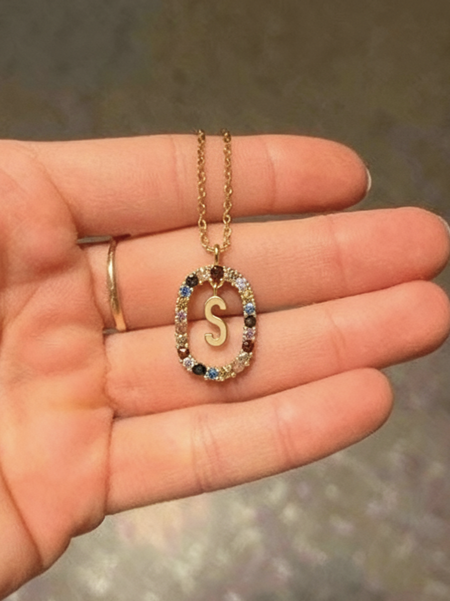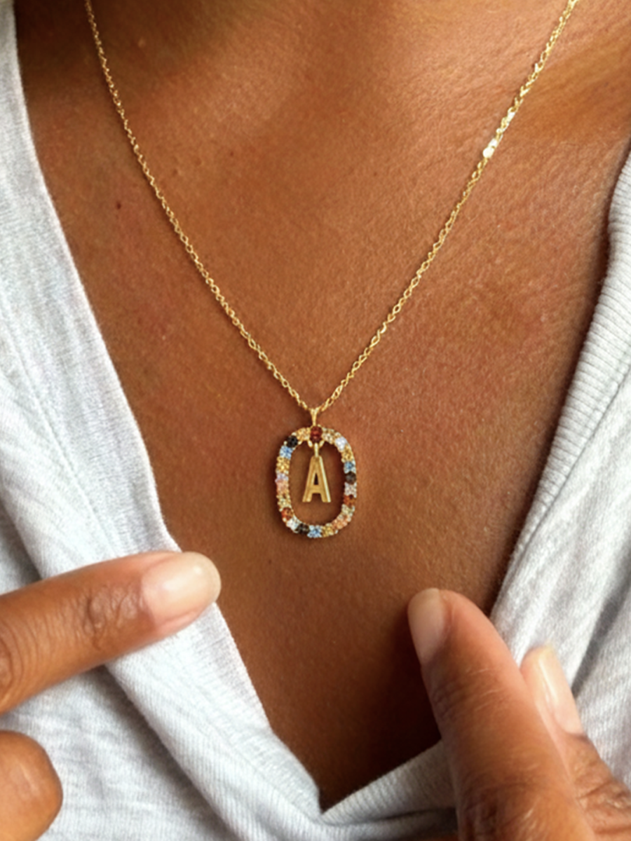 Tilføj et strejf af farve og elegance til din stil med dette initialhalskæde, delikat prydet med flerfarvede rhinsten. Dets gyldne bogstavsformede vedhæng, ophængt i midten af en glitrende cirkel, fanger lyset fra alle vinkler for en garanteret glitrende effekt. Hver rhinsten er omhyggeligt udvalgt for at tilbyde en lys og glædelig palet, hvilket gør hvert initial endnu mere værdifuldt.