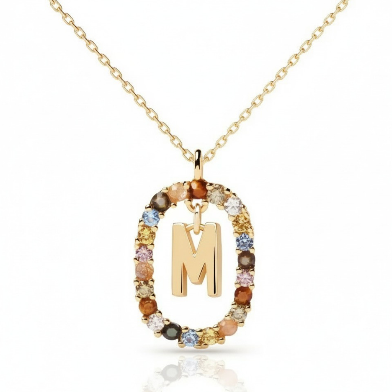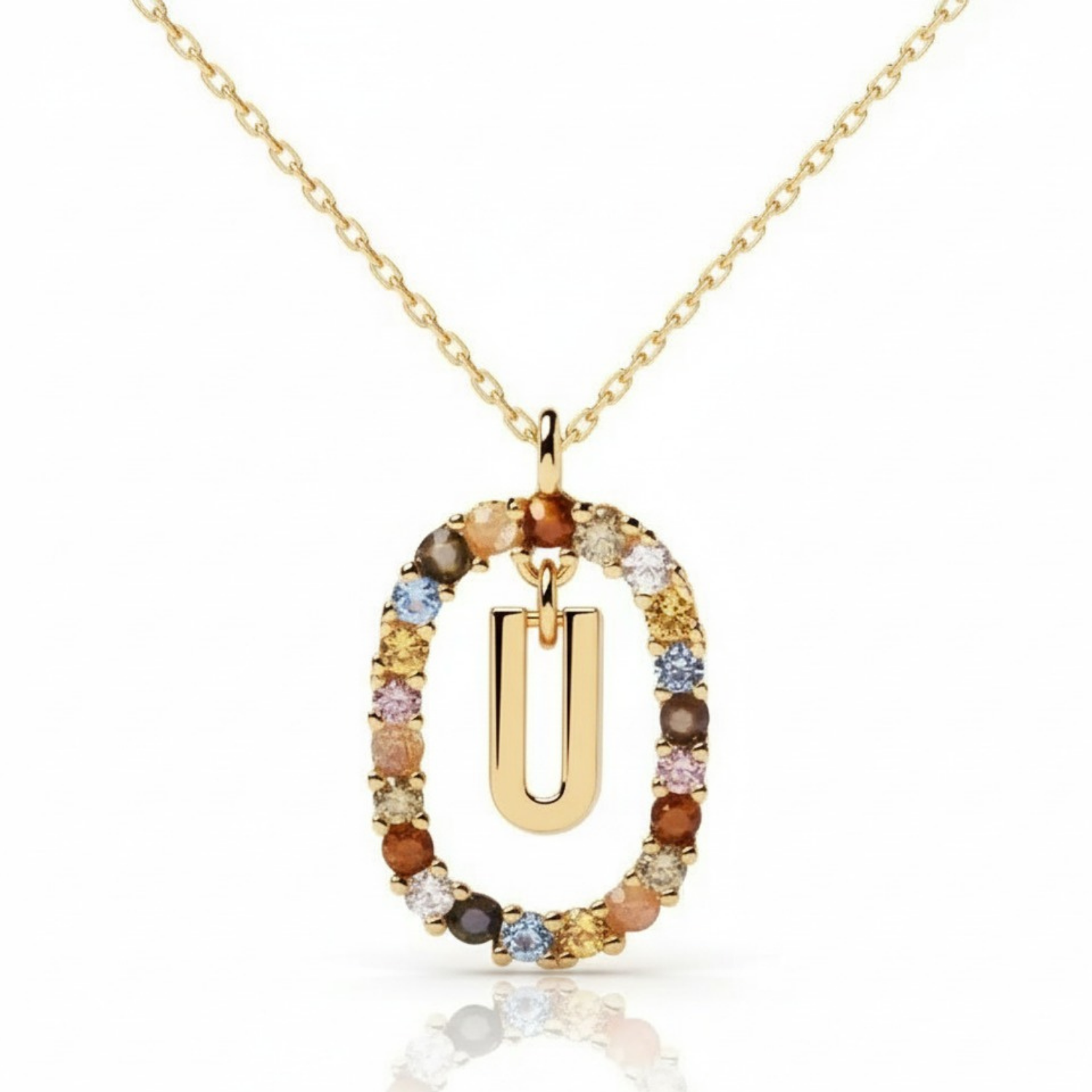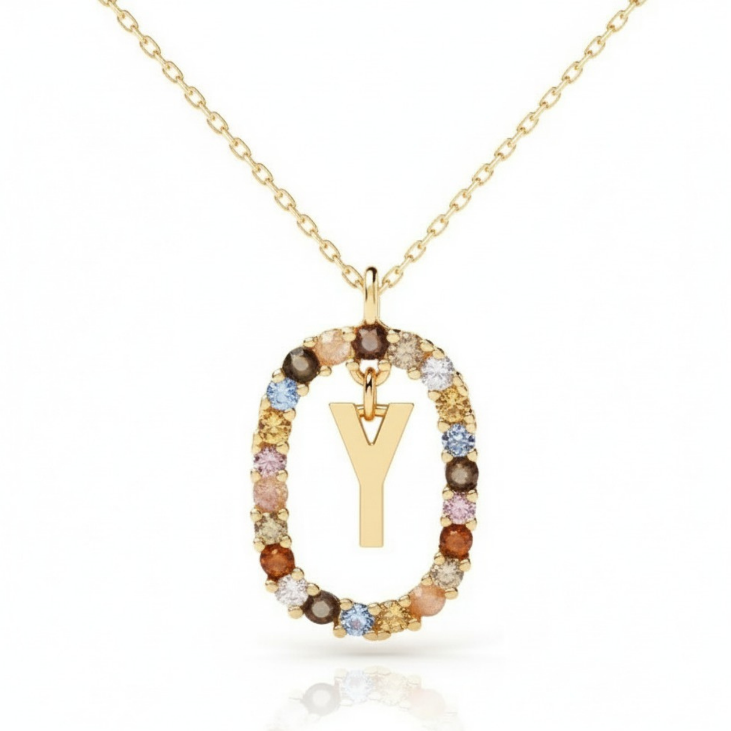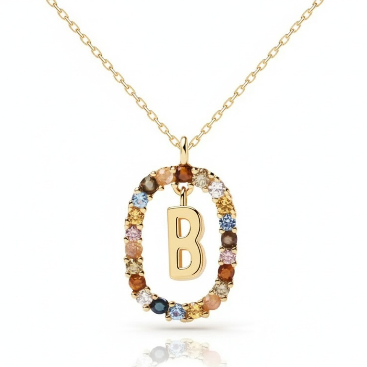 Tilføj et strejf af farve og elegance til din stil med dette initialhalskæde, delikat prydet med flerfarvede rhinsten. Dets gyldne bogstavsformede vedhæng, ophængt i midten af en glitrende cirkel, fanger lyset fra alle vinkler for en garanteret glitrende effekt. Hver rhinsten er omhyggeligt udvalgt for at tilbyde en lys og glædelig palet, hvilket gør hvert initial endnu mere værdifuldt.