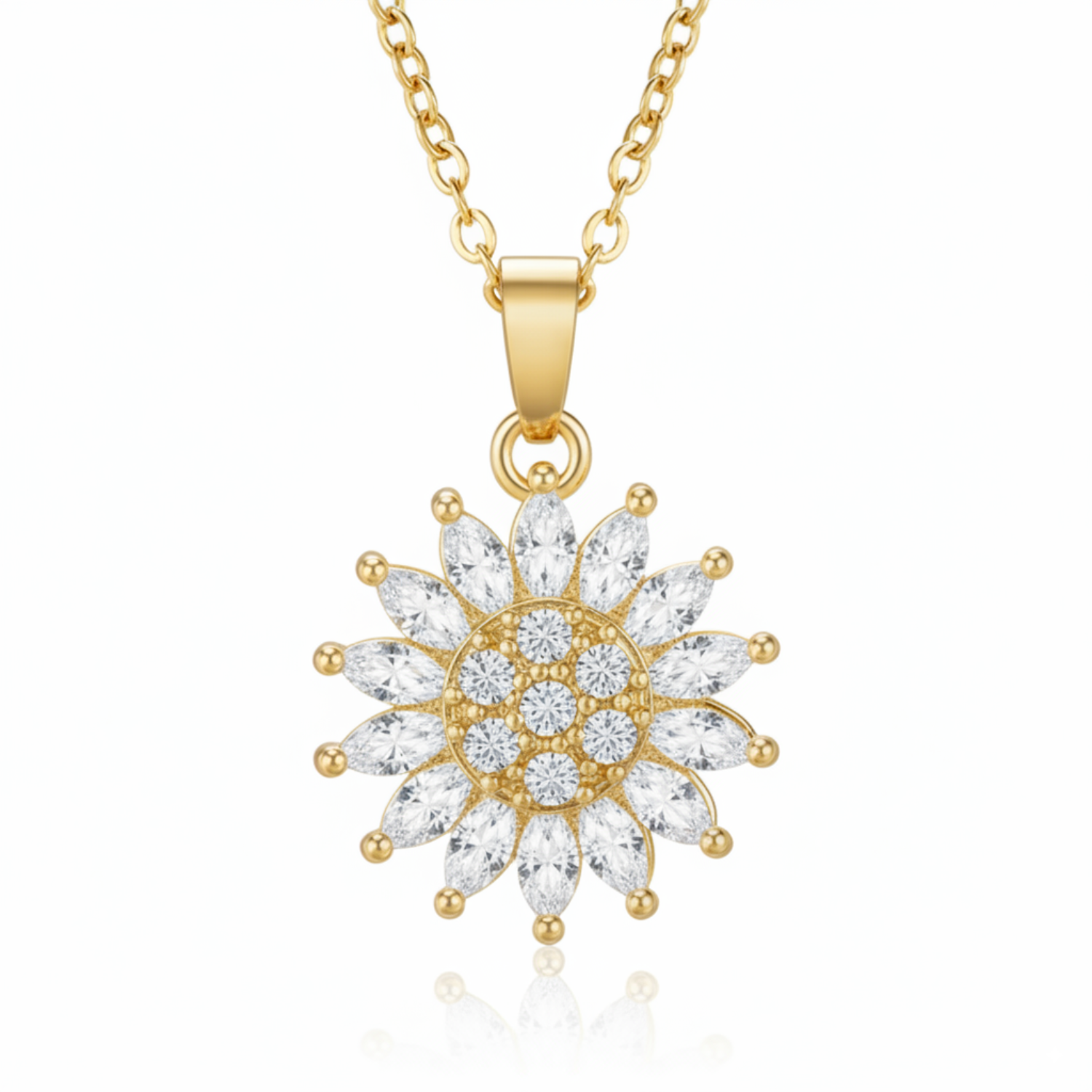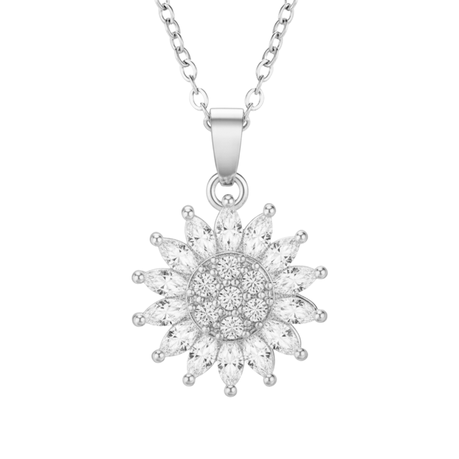 Skin med skønhed iført denne elegante halskæde med et roterende solsikkevedhæng. Hver glitrende blomst er fint sat med skinnende zirkoner, der fanger lyset ved hver bevægelse. Takket være dens diskrete roterende mekanisme kan vedhænget dreje om sig selv, hvilket tilføjer et legende og fascinerende præg til dette raffinerede smykke.