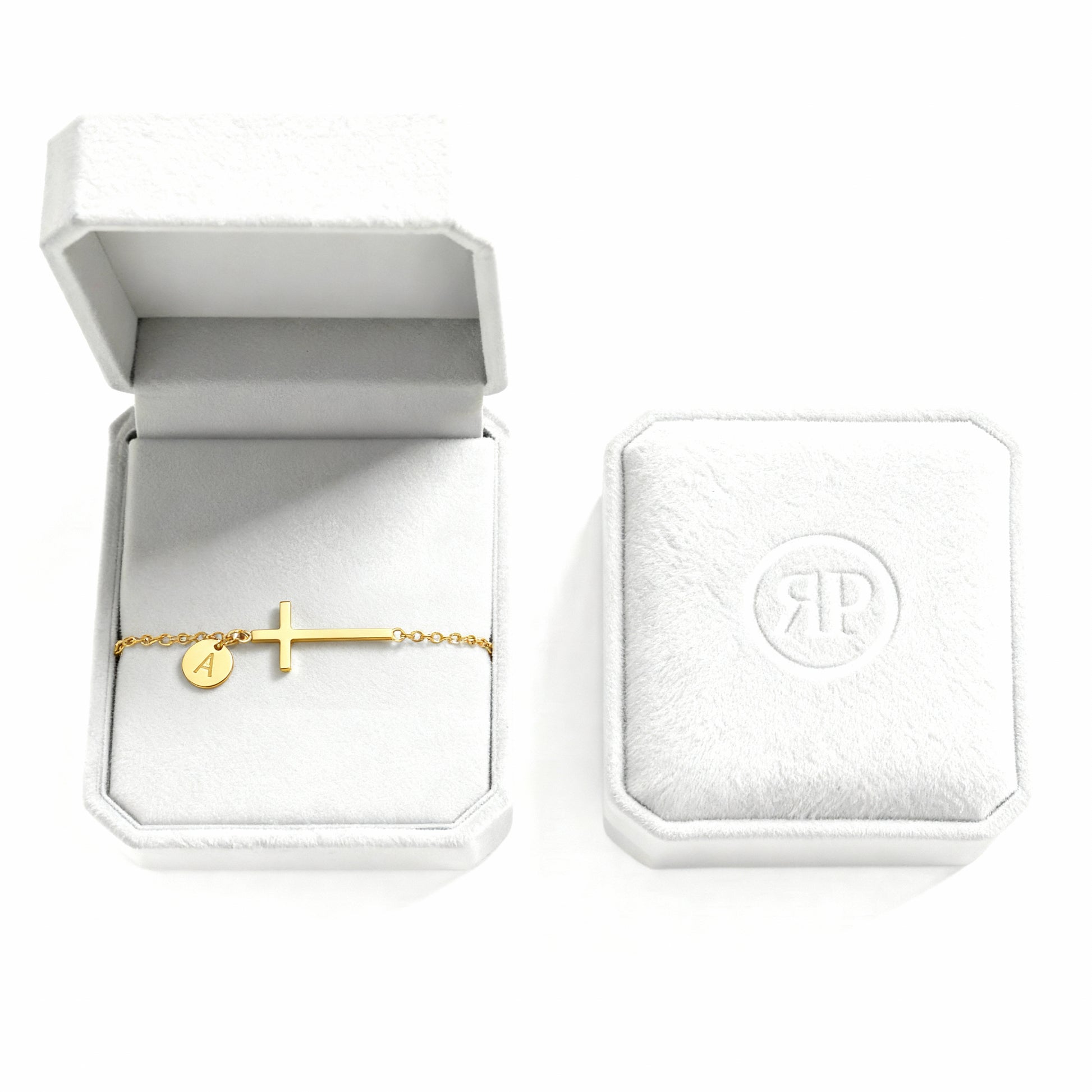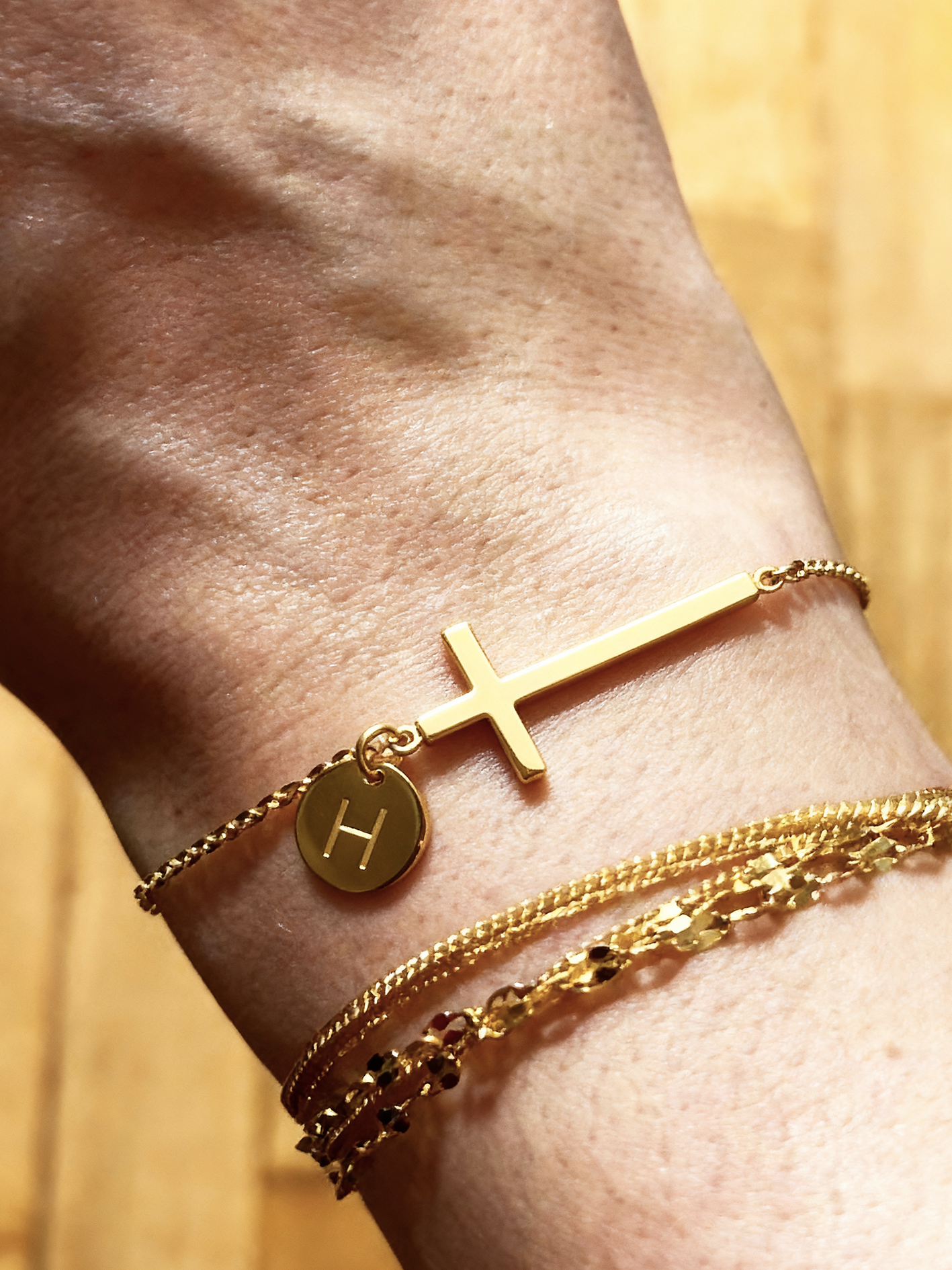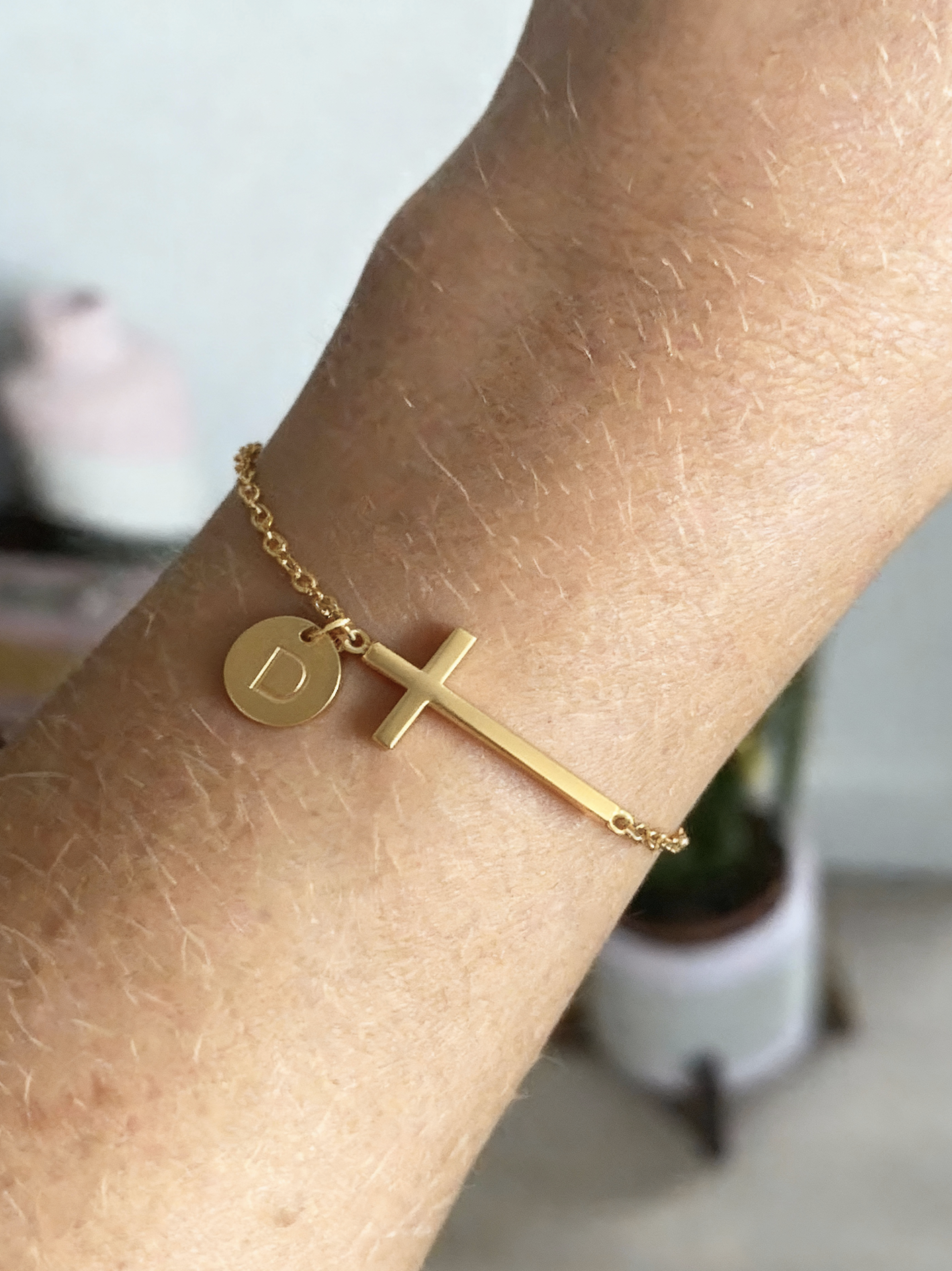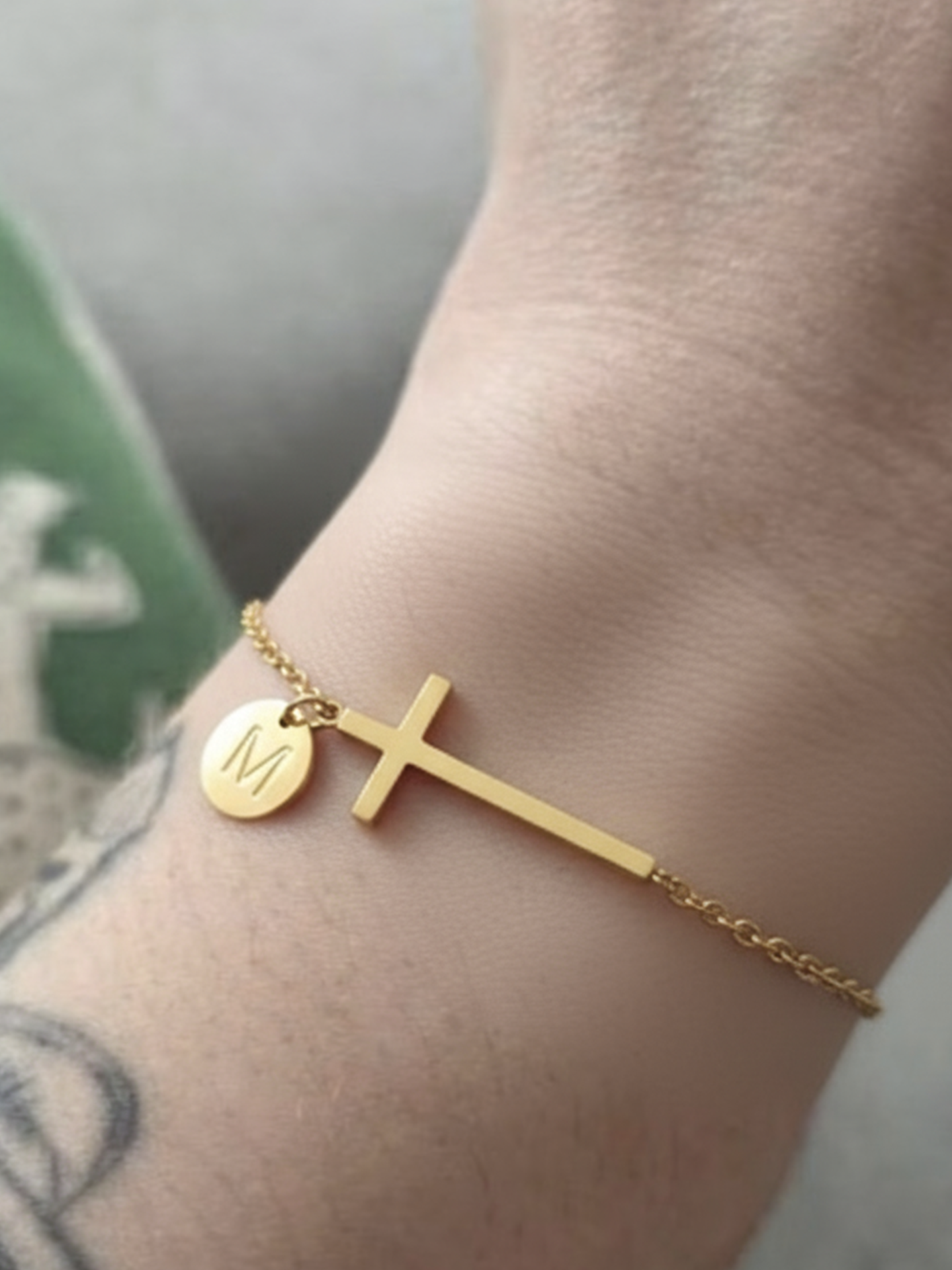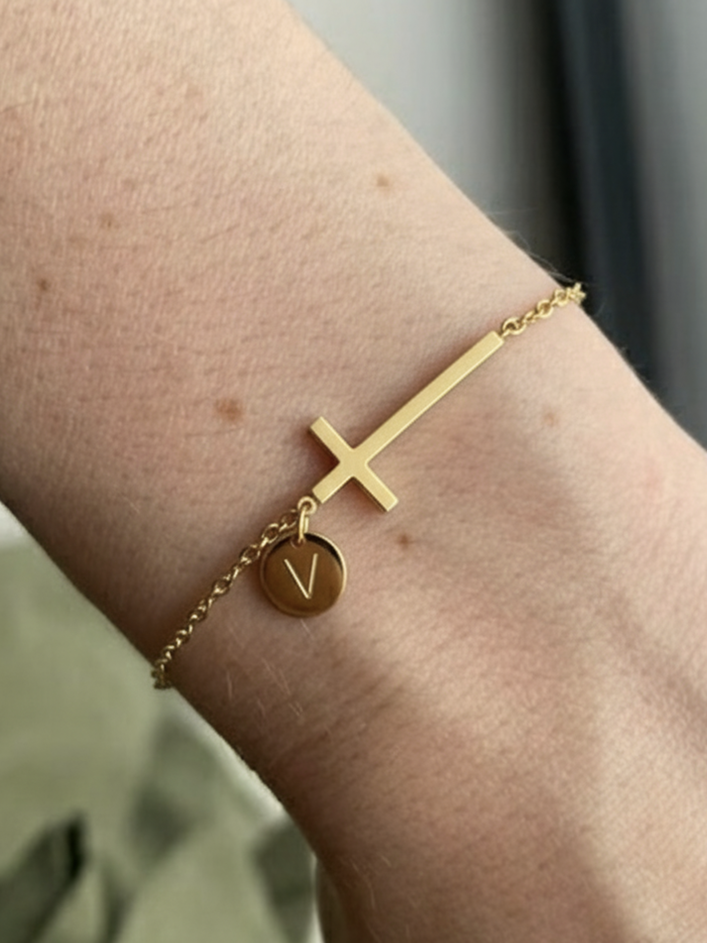 Et armbånd i guldfarve med et elegant kors og en personlig initialvedhæng. Dette minimalistiske design kombinerer elegant tro og identitet i ét smukt stykke.